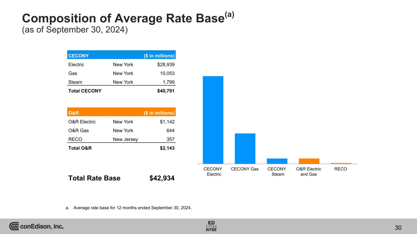 Composition of Average Rate Base(a) (as of September 30, 2024) a. Average rate base for 12 months ended September 30, 2024. CECONY ($ in millions) Electric New York $28,939 Gas New York 10,053 Steam New York 1,799 Total CECONY $40,791 O&R ($ in millions) O&R Electric New York $1,142 O&R Gas New York 644 RECO New Jersey 357 Total O&R $2,143 Total Rate Base $42,934 CECONY Electric CECONY Gas CECONY Steam O&R Electric and Gas RECO 30