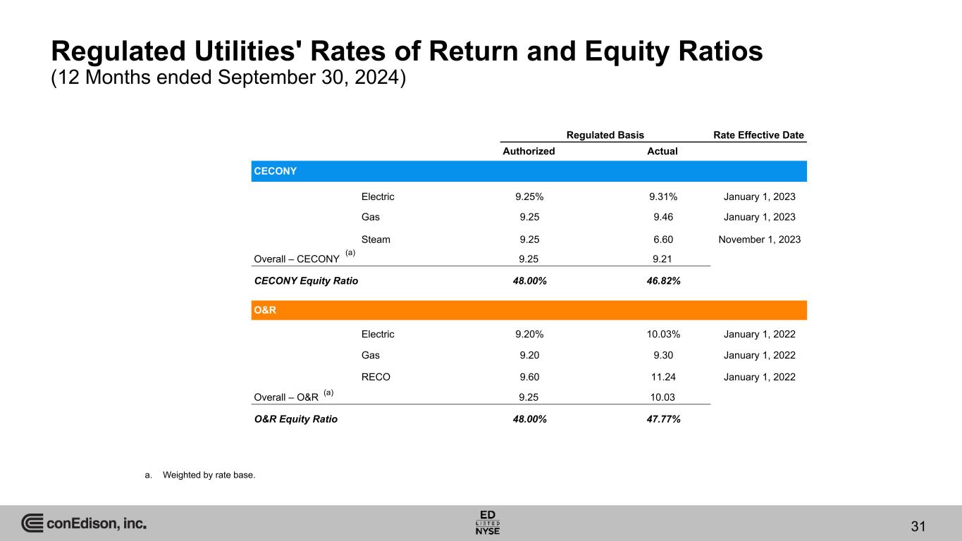 Regulated Utilities' Rates of Return and Equity Ratios (12 Months ended September 30, 2024) Regulated Basis Rate Effective Date Authorized Actual CECONY Electric 9.25% 9.31% January 1, 2023 Gas 9.25 9.46 January 1, 2023 Steam 9.25 6.60 November 1, 2023 Overall – CECONY 9.25 9.21 CECONY Equity Ratio 48.00% 46.82% O&R Electric 9.20% 10.03% January 1, 2022 Gas 9.20 9.30 January 1, 2022 RECO 9.60 11.24 January 1, 2022 Overall – O&R 9.25 10.03 O&R Equity Ratio 48.00% 47.77% a. Weighted by rate base. (a) (a) 31