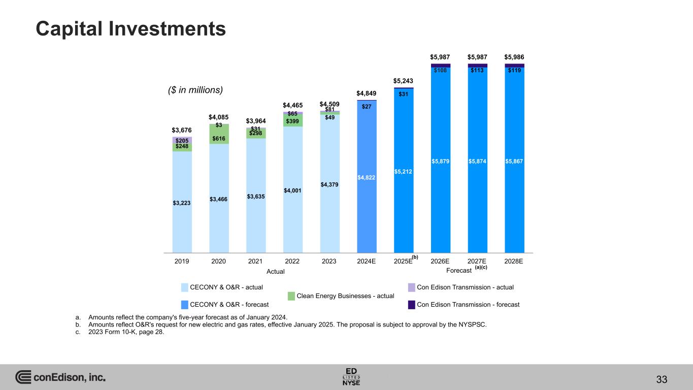$30,559 $32,359 $35,038 $37,309 $40,241 $42,301 $44,555 $47,557 $50,654 $54,872 $29,008 $30,697 $33,239 $35,380 $38,192 $40,151 $42,271 $45,128 $48,063 $52,088 $1,551 $1,662 $1,799 $1,929 $2,049 $2,150 $2,284 $2,429 $2,591 $2,784 Average Rate Base Balances O&R CECONY 5-year CAGR 6.4% 2019 2020 2021 2022 2023 2024E 2025E 2026E 2027E 2028E CECONY Electric $21,149 $22,101 $23,614 $24,753 $26,680 $27,923 $29,362 $31,238 $33,301 $36,280 Gas 6,408 7,110 8,008 8,924 9,692 10,428 11,061 12,008 12,827 13,828 Steam 1,451 1,486 1,617 1,703 1,820 1,800 1,848 1,882 1,935 1,980 O&R Electric 842 901 965 1,032 1,083 1,144 1,223 1,306 1,392 1,489 Gas 455 490 527 578 626 649 681 718 768 836 RECO Electric 254 271 307 319 340 357 380 405 431 459 ForecastActual a. Amounts reflect O&R's request for new electric and gas rates, effective January 2025. The proposal is subject to approval by the NYSPSC. b. Amounts reflect the company's five-year forecast presented to the Board of Directors on January 18, 2024. . (a)(b) (a)(b) (b) (b) (b) (b) ($ in millions) 32