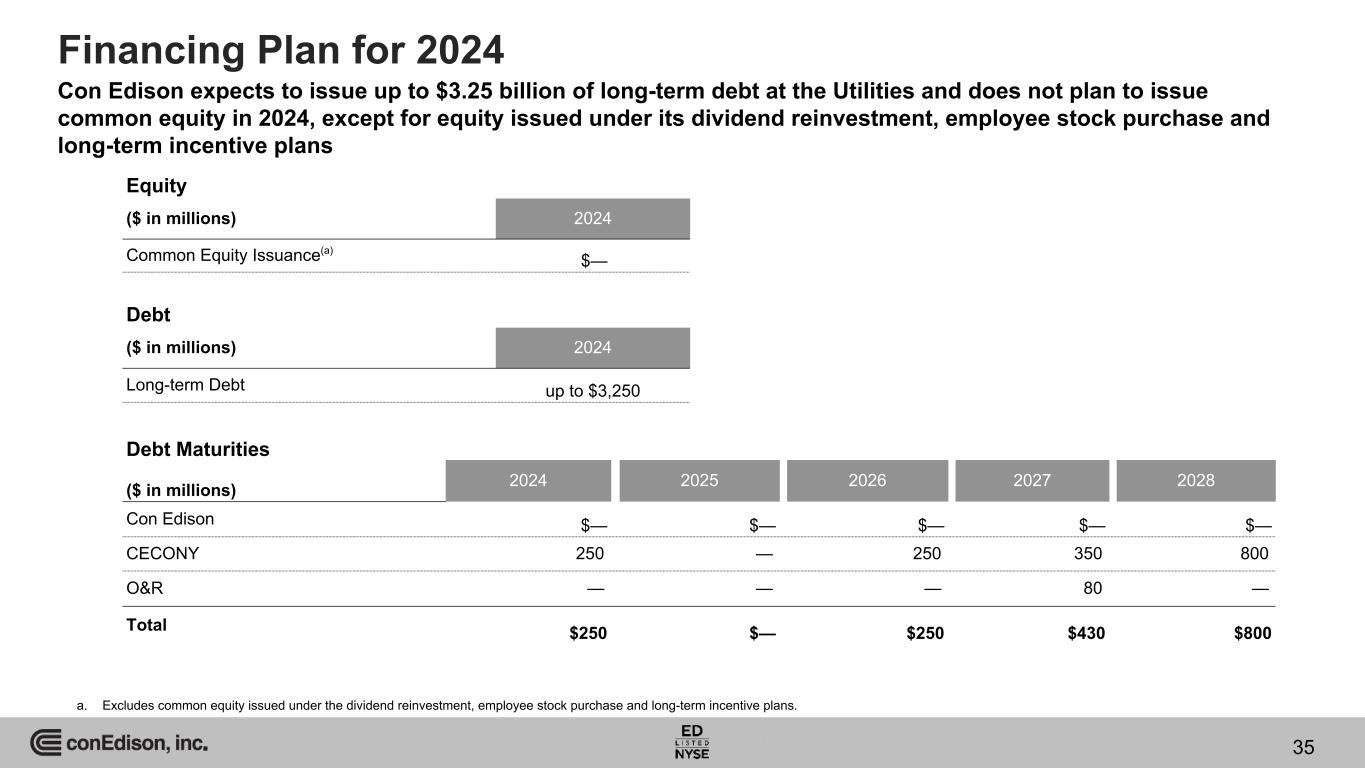Financing Plan for 2024 Equity ($ in millions) 2024 Common Equity Issuance(a) $— Debt ($ in millions) 2024 Long-term Debt up to $3,250 a. Excludes common equity issued under the dividend reinvestment, employee stock purchase and long-term incentive plans. Debt Maturities ($ in millions) 2024 2025 2026 2027 2028 Con Edison $— $— $— $— $— CECONY 250 — 250 350 800 O&R — — — 80 — Total $250 $— $250 $430 $800 Con Edison expects to issue up to $3.25 billion of long-term debt at the Utilities and does not plan to issue common equity in 2024, except for equity issued under its dividend reinvestment, employee stock purchase and long-term incentive plans 35