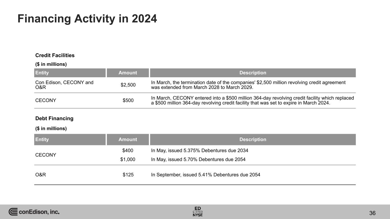 Financing Activity in 2024 Credit Facilities ($ in millions) Entity Amount Description Con Edison, CECONY and O&R $2,500 In March, the termination date of the companies' $2,500 million revolving credit agreement was extended from March 2028 to March 2029. CECONY $500 In March, CECONY entered into a $500 million 364-day revolving credit facility which replaced a $500 million 364-day revolving credit facility that was set to expire in March 2024. 36 Debt Financing ($ in millions) Entity Amount Description CECONY $400 $1,000 In May, issued 5.375% Debentures due 2034 In May, issued 5.70% Debentures due 2054 O&R $125 In September, issued 5.41% Debentures due 2054