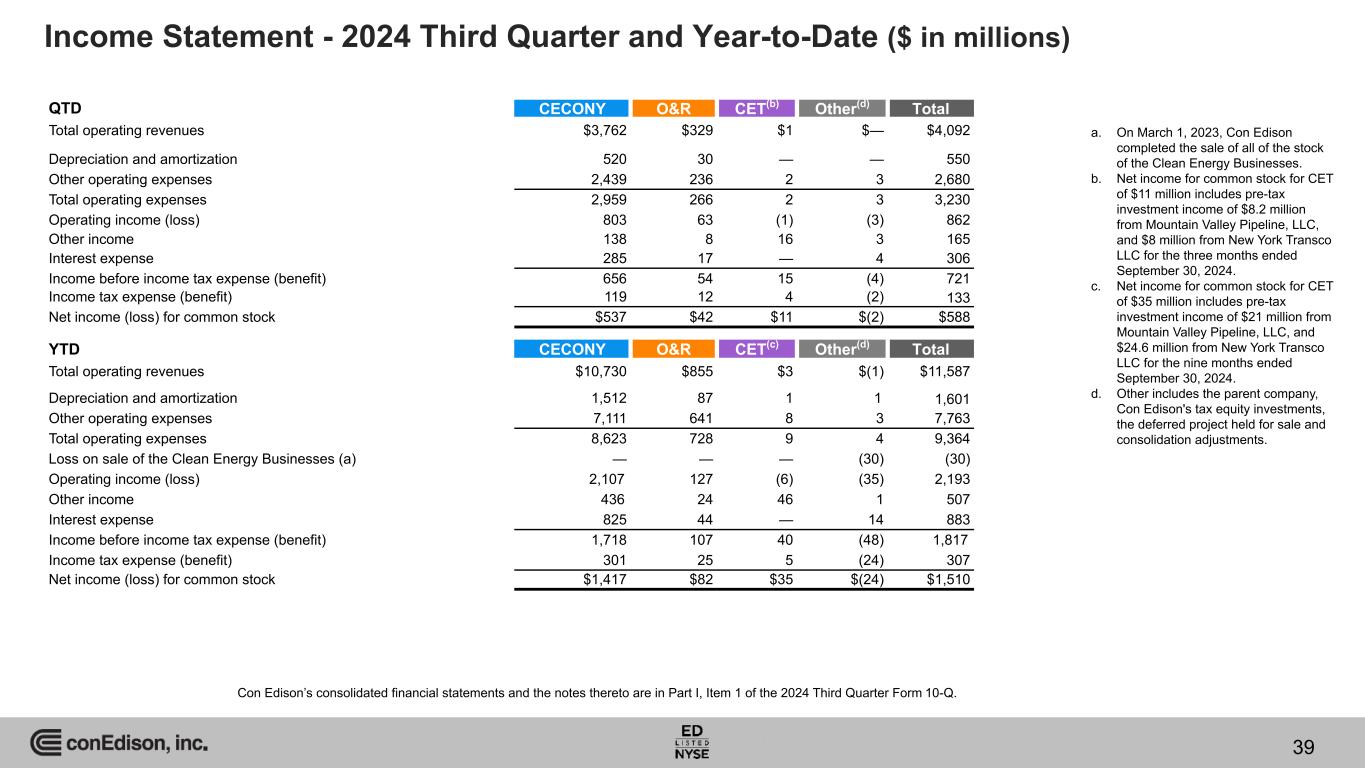 Income Statement - 2024 Third Quarter and Year-to-Date ($ in millions) QTD CECONY O&R CET(b) Other(d) Total Total operating revenues $3,762 $329 $1 $— $4,092 Depreciation and amortization 520 30 — — 550 Other operating expenses 2,439 236 2 3 2,680 Total operating expenses 2,959 266 2 3 3,230 Operating income (loss) 803 63 (1) (3) 862 Other income 138 8 16 3 165 Interest expense 285 17 — 4 306 Income before income tax expense (benefit) 656 54 15 (4) 721 Income tax expense (benefit) 119 12 4 (2) 133 Net income (loss) for common stock $537 $42 $11 $(2) $588 YTD CECONY O&R CET(c) Other(d) Total Total operating revenues $10,730 $855 $3 $(1) $11,587 Depreciation and amortization 1,512 87 1 1 1,601 Other operating expenses 7,111 641 8 3 7,763 Total operating expenses 8,623 728 9 4 9,364 Loss on sale of the Clean Energy Businesses (a) — — — (30) (30) Operating income (loss) 2,107 127 (6) (35) 2,193 Other income 436 24 46 1 507 Interest expense 825 44 — 14 883 Income before income tax expense (benefit) 1,718 107 40 (48) 1,817 Income tax expense (benefit) 301 25 5 (24) 307 Net income (loss) for common stock $1,417 $82 $35 $(24) $1,510 a. On March 1, 2023, Con Edison completed the sale of all of the stock of the Clean Energy Businesses. b. Net income for common stock for CET of $11 million includes pre-tax investment income of $8.2 million from Mountain Valley Pipeline, LLC, and $8 million from New York Transco LLC for the three months ended September 30, 2024. c. Net income for common stock for CET of $35 million includes pre-tax investment income of $21 million from Mountain Valley Pipeline, LLC, and $24.6 million from New York Transco LLC for the nine months ended September 30, 2024. d. Other includes the parent company, Con Edison's tax equity investments, the deferred project held for sale and consolidation adjustments. Con Edison’s consolidated financial statements and the notes thereto are in Part I, Item 1 of the 2024 Third Quarter Form 10-Q. 39