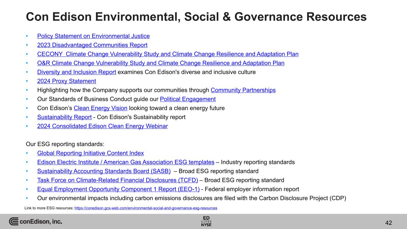 Con Edison Environmental, Social & Governance Resources • Policy Statement on Environmental Justice • 2023 Disadvantaged Communities Report • CECONY Climate Change Vulnerability Study and Climate Change Resilience and Adaptation Plan • O&R Climate Change Vulnerability Study and Climate Change Resilience and Adaptation Plan • Diversity and Inclusion Report examines Con Edison's diverse and inclusive culture • 2024 Proxy Statement • Highlighting how the Company supports our communities through Community Partnerships • Our Standards of Business Conduct guide our Political Engagement • Con Edison’s Clean Energy Vision looking toward a clean energy future • Sustainability Report - Con Edison's Sustainability report • 2024 Consolidated Edison Clean Energy Webinar Our ESG reporting standards: • Global Reporting Initiative Content Index • Edison Electric Institute / American Gas Association ESG templates – Industry reporting standards • Sustainability Accounting Standards Board (SASB) – Broad ESG reporting standard • Task Force on Climate-Related Financial Disclosures (TCFD) – Broad ESG reporting standard • Equal Employment Opportunity Component 1 Report (EEO-1) - Federal employer information report • Our environmental impacts including carbon emissions disclosures are filed with the Carbon Disclosure Project (CDP) Link to more ESG resources: https://conedison.gcs-web.com/environmental-social-and-governance-esg-resources 42