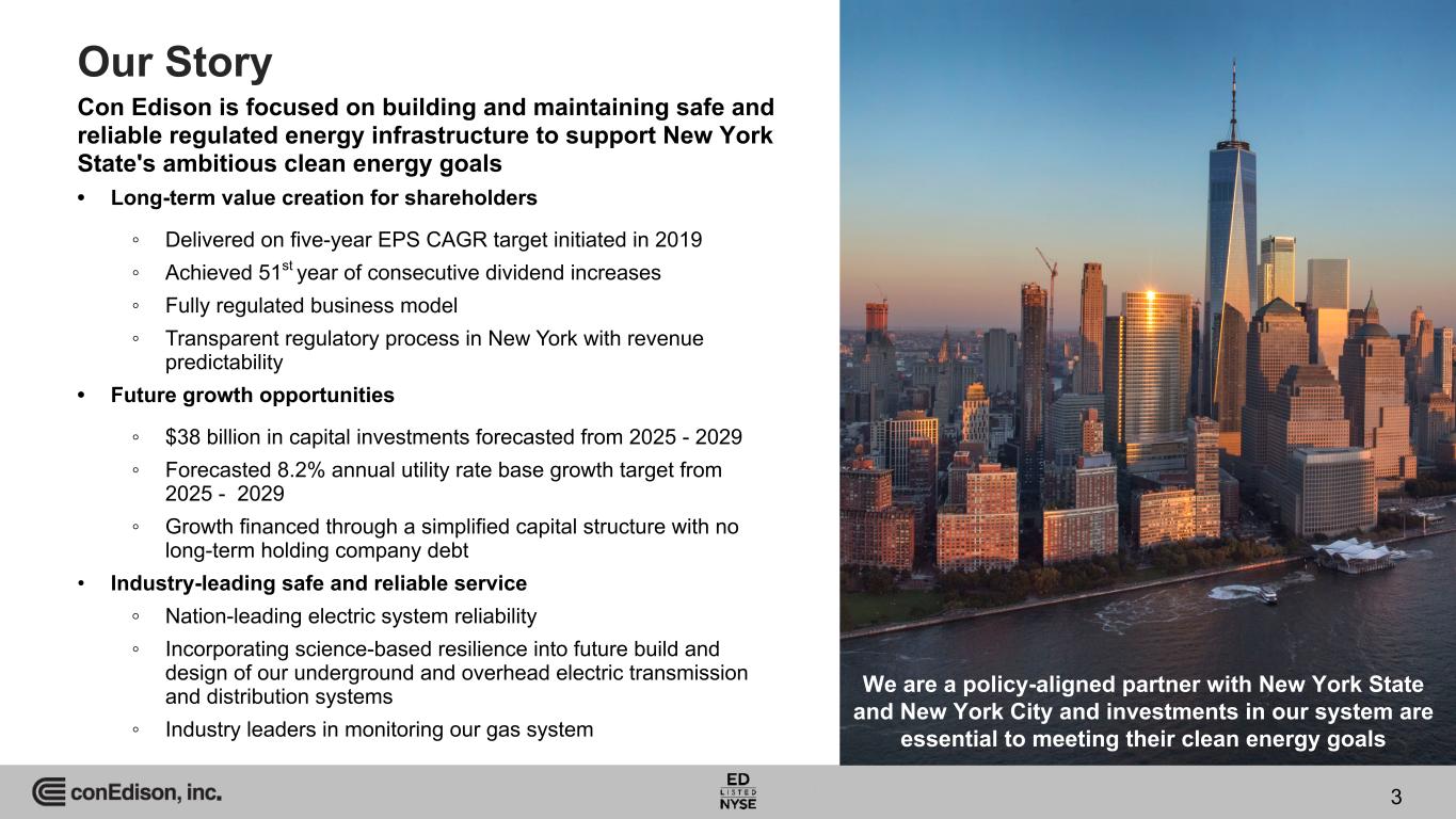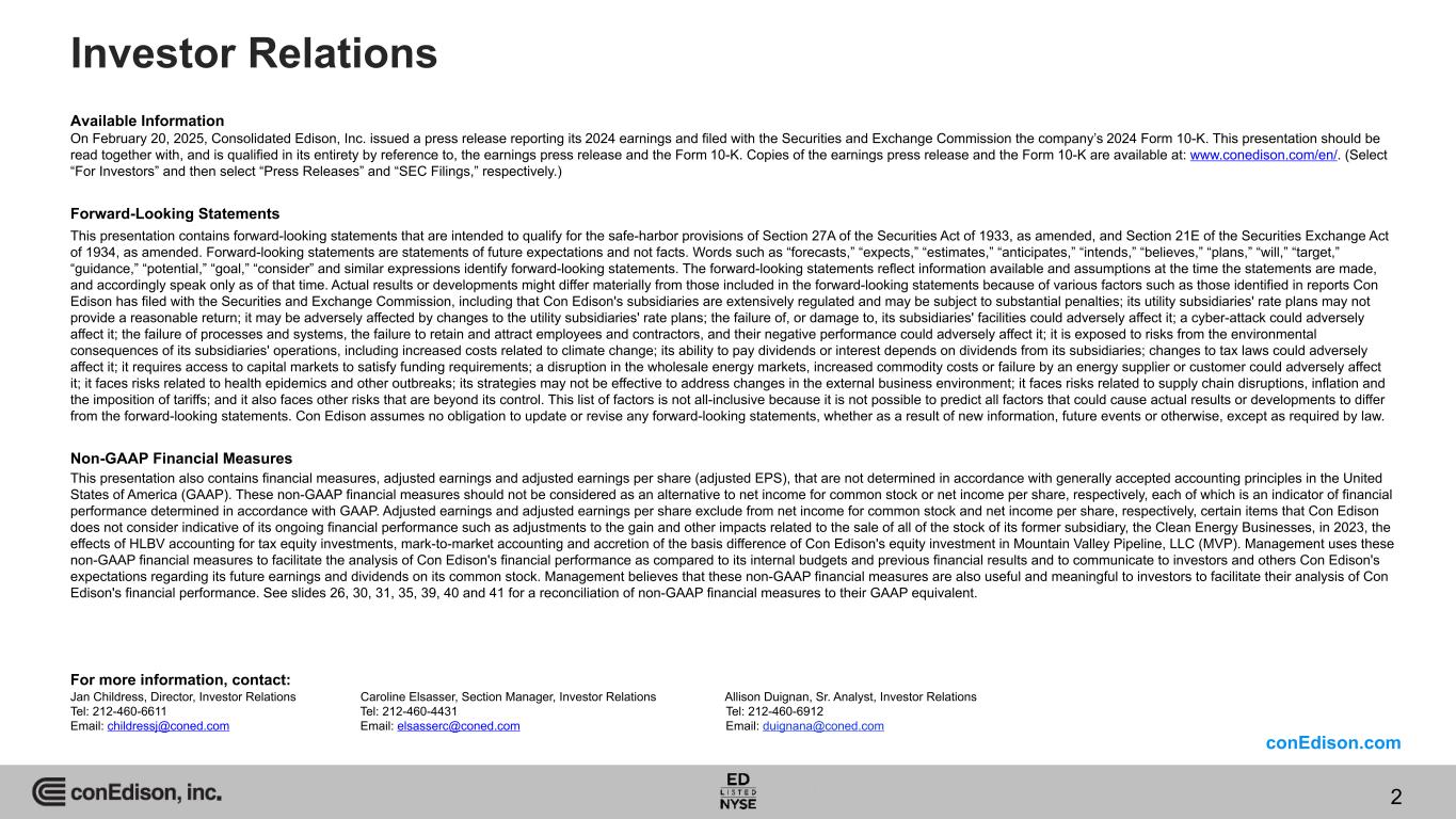 Available Information On February 20, 2025, Consolidated Edison, Inc. issued a press release reporting its 2024 earnings and filed with the Securities and Exchange Commission the company’s 2024 Form 10-K. This presentation should be read together with, and is qualified in its entirety by reference to, the earnings press release and the Form 10-K. Copies of the earnings press release and the Form 10-K are available at: www.conedison.com/en/. (Select “For Investors” and then select “Press Releases” and “SEC Filings,” respectively.) Forward-Looking Statements This presentation contains forward-looking statements that are intended to qualify for the safe-harbor provisions of Section 27A of the Securities Act of 1933, as amended, and Section 21E of the Securities Exchange Act of 1934, as amended. Forward-looking statements are statements of future expectations and not facts. Words such as “forecasts,” “expects,” “estimates,” “anticipates,” “intends,” “believes,” “plans,” “will,” “target,” “guidance,” “potential,” “goal,” “consider” and similar expressions identify forward-looking statements. The forward-looking statements reflect information available and assumptions at the time the statements are made, and accordingly speak only as of that time. Actual results or developments might differ materially from those included in the forward-looking statements because of various factors such as those identified in reports Con Edison has filed with the Securities and Exchange Commission, including that Con Edison's subsidiaries are extensively regulated and may be subject to substantial penalties; its utility subsidiaries' rate plans may not provide a reasonable return; it may be adversely affected by changes to the utility subsidiaries' rate plans; the failure of, or damage to, its subsidiaries' facilities could adversely affect it; a cyber-attack could adversely affect it; the failure of processes and systems, the failure to retain and attract employees and contractors, and their negative performance could adversely affect it; it is exposed to risks from the environmental consequences of its subsidiaries' operations, including increased costs related to climate change; its ability to pay dividends or interest depends on dividends from its subsidiaries; changes to tax laws could adversely affect it; it requires access to capital markets to satisfy funding requirements; a disruption in the wholesale energy markets, increased commodity costs or failure by an energy supplier or customer could adversely affect it; it faces risks related to health epidemics and other outbreaks; its strategies may not be effective to address changes in the external business environment; it faces risks related to supply chain disruptions, inflation and the imposition of tariffs; and it also faces other risks that are beyond its control. This list of factors is not all-inclusive because it is not possible to predict all factors that could cause actual results or developments to differ from the forward-looking statements. Con Edison assumes no obligation to update or revise any forward-looking statements, whether as a result of new information, future events or otherwise, except as required by law. Non-GAAP Financial Measures This presentation also contains financial measures, adjusted earnings and adjusted earnings per share (adjusted EPS), that are not determined in accordance with generally accepted accounting principles in the United States of America (GAAP). These non-GAAP financial measures should not be considered as an alternative to net income for common stock or net income per share, respectively, each of which is an indicator of financial performance determined in accordance with GAAP. Adjusted earnings and adjusted earnings per share exclude from net income for common stock and net income per share, respectively, certain items that Con Edison does not consider indicative of its ongoing financial performance such as adjustments to the gain and other impacts related to the sale of all of the stock of its former subsidiary, the Clean Energy Businesses, in 2023, the effects of HLBV accounting for tax equity investments, mark-to-market accounting and accretion of the basis difference of Con Edison's equity investment in Mountain Valley Pipeline, LLC (MVP). Management uses these non-GAAP financial measures to facilitate the analysis of Con Edison's financial performance as compared to its internal budgets and previous financial results and to communicate to investors and others Con Edison's expectations regarding its future earnings and dividends on its common stock. Management believes that these non-GAAP financial measures are also useful and meaningful to investors to facilitate their analysis of Con Edison's financial performance. See slides 26, 30, 31, 35, 39, 40 and 41 for a reconciliation of non-GAAP financial measures to their GAAP equivalent. For more information, contact: Jan Childress, Director, Investor Relations Caroline Elsasser, Section Manager, Investor Relations Allison Duignan, Sr. Analyst, Investor Relations Tel: 212-460-6611 Tel: 212-460-4431 Tel: 212-460-6912 Email: childressj@coned.com Email: elsasserc@coned.com Email: duignana@coned.com Investor Relations conEdison.com 2