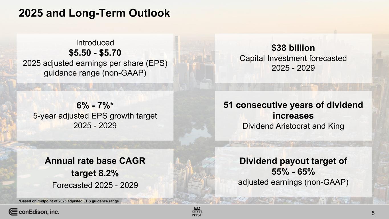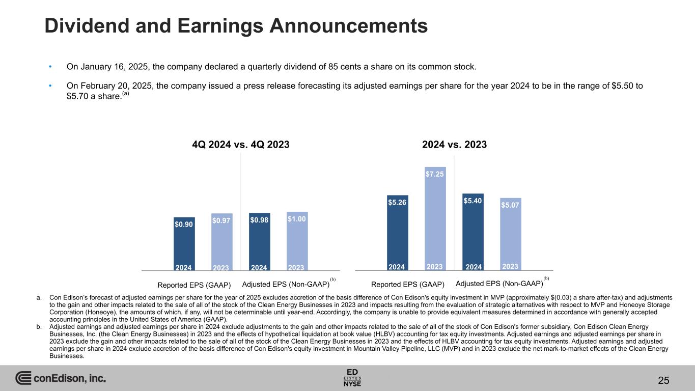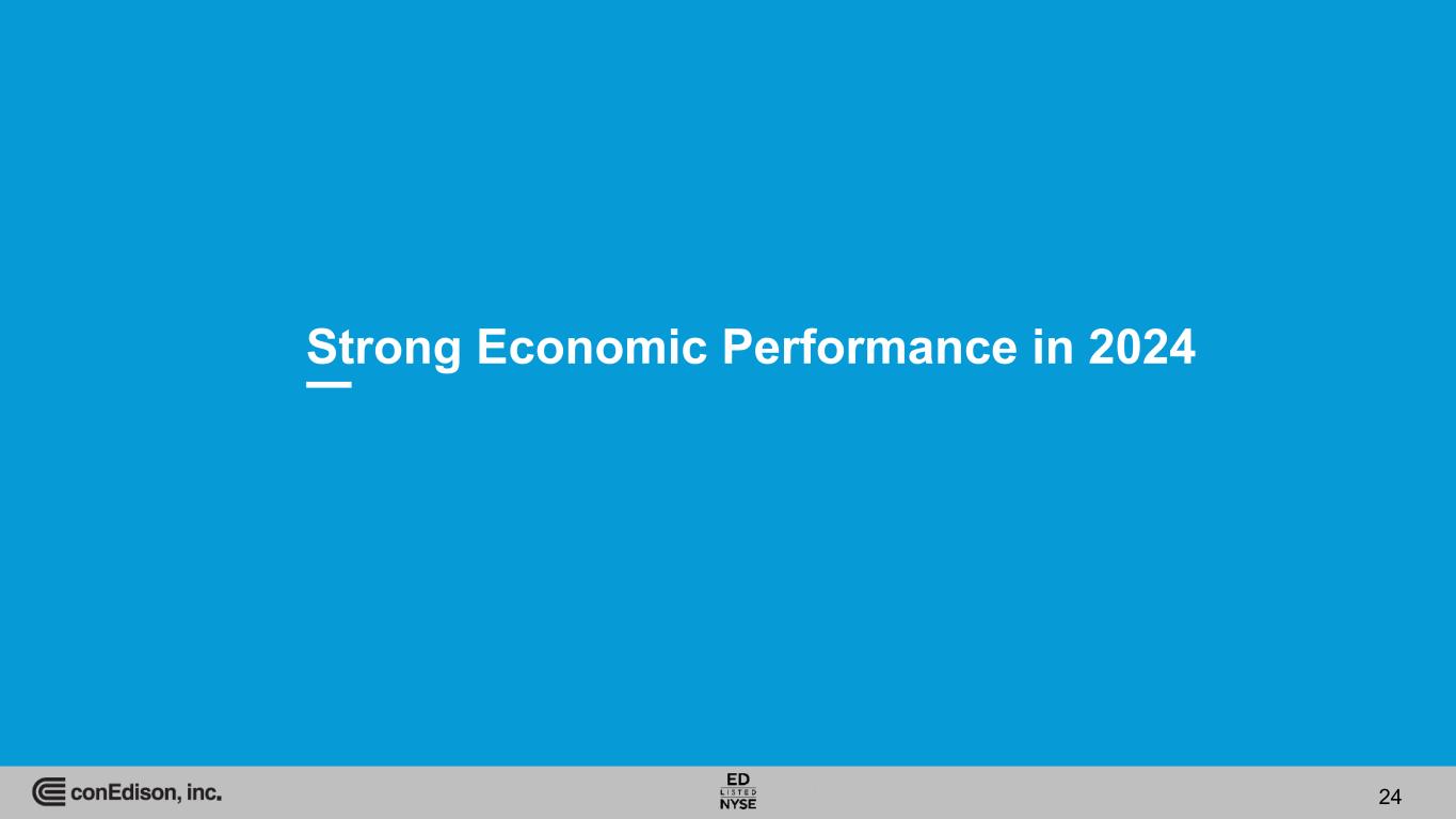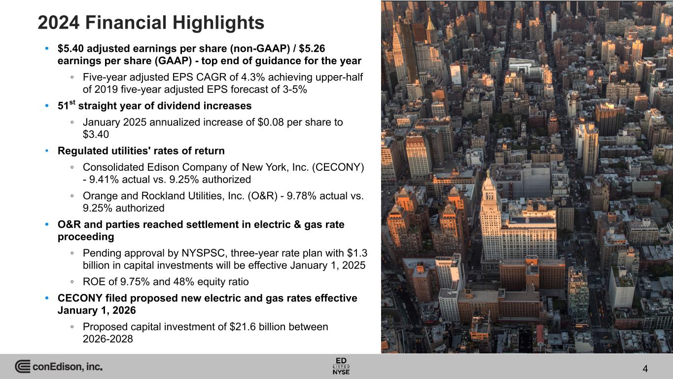 2024 Financial Highlights • $5.40 adjusted earnings per share (non-GAAP) / $5.26 earnings per share (GAAP) - top end of guidance for the year ◦ Five-year adjusted EPS CAGR of 4.3% achieving upper-half of 2019 five-year adjusted EPS forecast of 3-5% • 51st straight year of dividend increases ◦ January 2025 annualized increase of $0.08 per share to $3.40 • Regulated utilities' rates of return ◦ Consolidated Edison Company of New York, Inc. (CECONY) - 9.41% actual vs. 9.25% authorized ◦ Orange and Rockland Utilities, Inc. (O&R) - 9.78% actual vs. 9.25% authorized • O&R and parties reached settlement in electric & gas rate proceeding ◦ Pending approval by NYSPSC, three-year rate plan with $1.3 billion in capital investments will be effective January 1, 2025 ◦ ROE of 9.75% and 48% equity ratio • CECONY filed proposed new electric and gas rates effective January 1, 2026 ◦ Proposed capital investment of $21.6 billion between 2026-2028 4