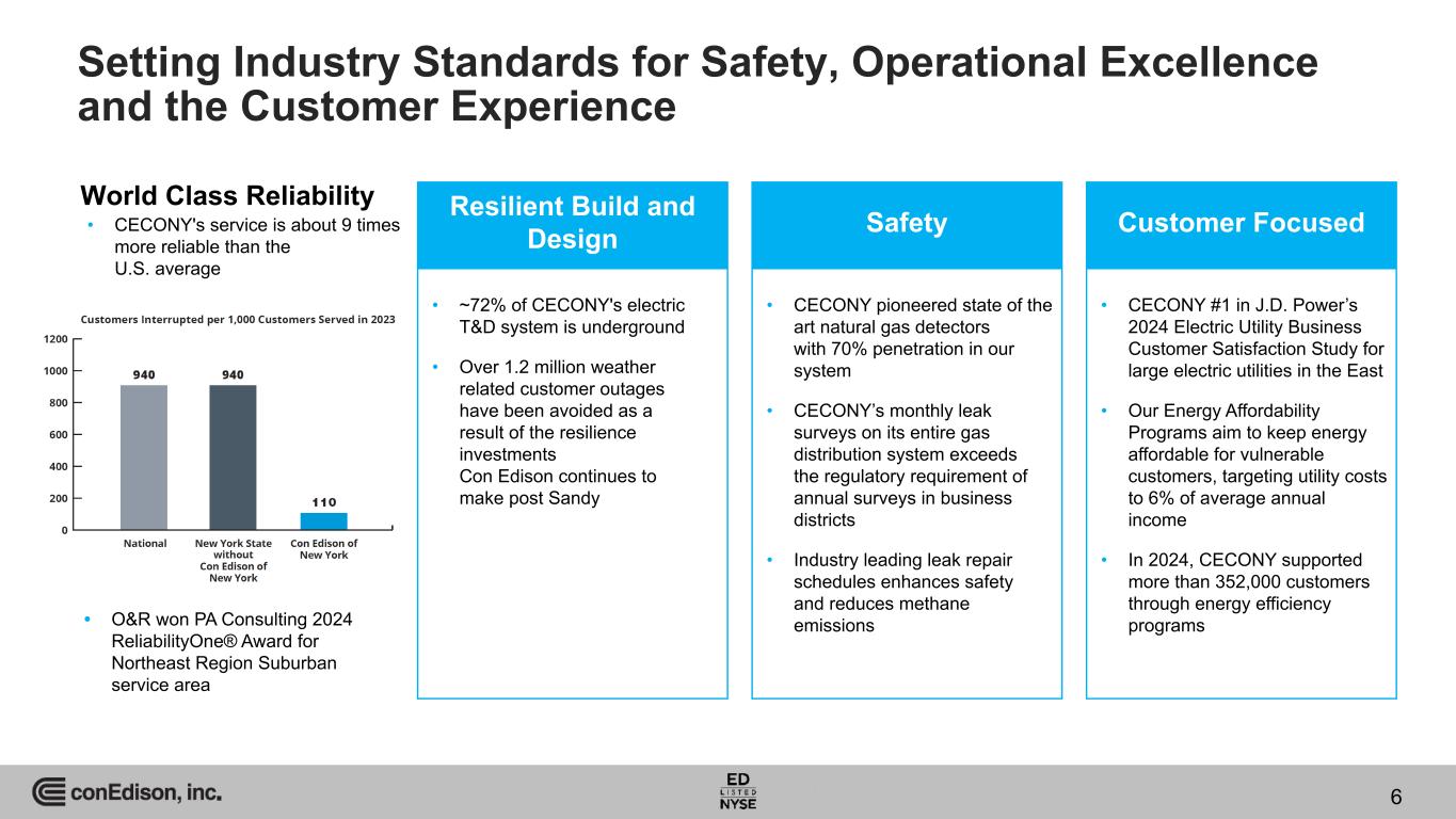 2025 and Long-Term Outlook 5 Introduced $5.50 - $5.70 2025 adjusted earnings per share (EPS) guidance range (non-GAAP) 6% - 7%* 5-year adjusted EPS growth target 2025 - 2029 Annual rate base CAGR target 8.2% Forecasted 2025 - 2029 $38 billion Capital Investment forecasted 2025 - 2029 51 consecutive years of dividend increases Dividend Aristocrat and King Dividend payout target of 55% - 65% adjusted earnings (non-GAAP) *Based on midpoint of 2025 adjusted EPS guidance range
