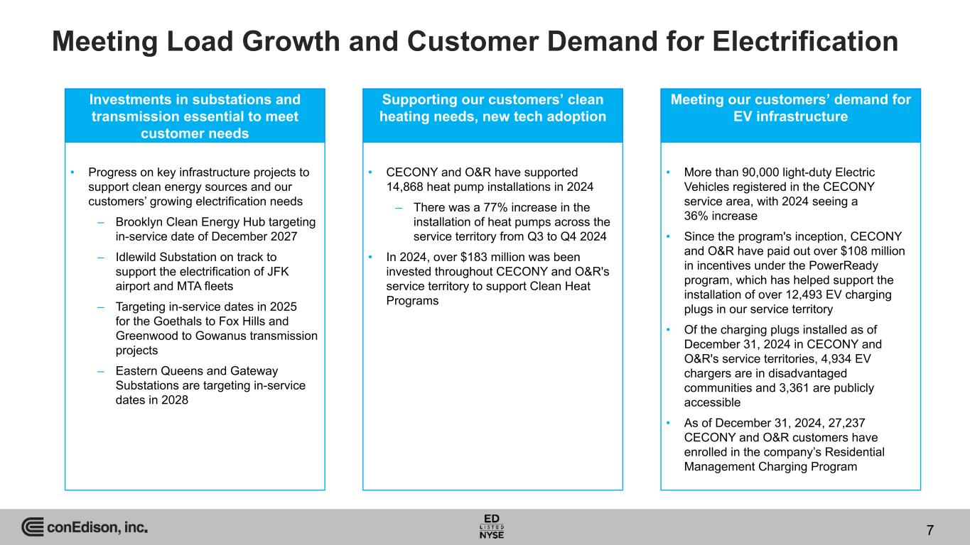 6 Setting Industry Standards for Safety, Operational Excellence and the Customer Experience 6 World Class Reliability • CECONY's service is about 9 times more reliable than the U.S. average • O&R won PA Consulting 2024 ReliabilityOne® Award for Northeast Region Suburban service area Resilient Build and Design • ~72% of CECONY's electric T&D system is underground • Over 1.2 million weather related customer outages have been avoided as a result of the resilience investments Con Edison continues to make post Sandy Safety • CECONY pioneered state of the art natural gas detectors with 70% penetration in our system • CECONY’s monthly leak surveys on its entire gas distribution system exceeds the regulatory requirement of annual surveys in business districts • Industry leading leak repair schedules enhances safety and reduces methane emissions Customer Focused • CECONY #1 in J.D. Power’s 2024 Electric Utility Business Customer Satisfaction Study for large electric utilities in the East • Our Energy Affordability Programs aim to keep energy affordable for vulnerable customers, targeting utility costs to 6% of average annual income • In 2024, CECONY supported more than 352,000 customers through energy efficiency programs