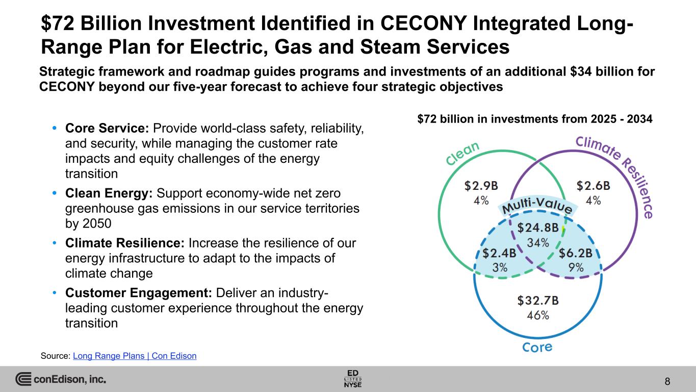 7 Meeting Load Growth and Customer Demand for Electrification 7 Investments in substations and transmission essential to meet customer needs • Progress on key infrastructure projects to support clean energy sources and our customers’ growing electrification needs – Brooklyn Clean Energy Hub targeting in-service date of December 2027 – Idlewild Substation on track to support the electrification of JFK airport and MTA fleets – Targeting in-service dates in 2025 for the Goethals to Fox Hills and Greenwood to Gowanus transmission projects – Eastern Queens and Gateway Substations are targeting in-service dates in 2028 Supporting our customers’ clean heating needs, new tech adoption • CECONY and O&R have supported 14,868 heat pump installations in 2024 – There was a 77% increase in the installation of heat pumps across the service territory from Q3 to Q4 2024 • In 2024, over $183 million was been invested throughout CECONY and O&R's service territory to support Clean Heat Programs Meeting our customers’ demand for EV infrastructure • More than 90,000 light-duty Electric Vehicles registered in the CECONY service area, with 2024 seeing a 36% increase • Since the program's inception, CECONY and O&R have paid out over $108 million in incentives under the PowerReady program, which has helped support the installation of over 12,493 EV charging plugs in our service territory • Of the charging plugs installed as of December 31, 2024 in CECONY and O&R's service territories, 4,934 EV chargers are in disadvantaged communities and 3,361 are publicly accessible • As of December 31, 2024, 27,237 CECONY and O&R customers have enrolled in the company’s Residential Management Charging Program