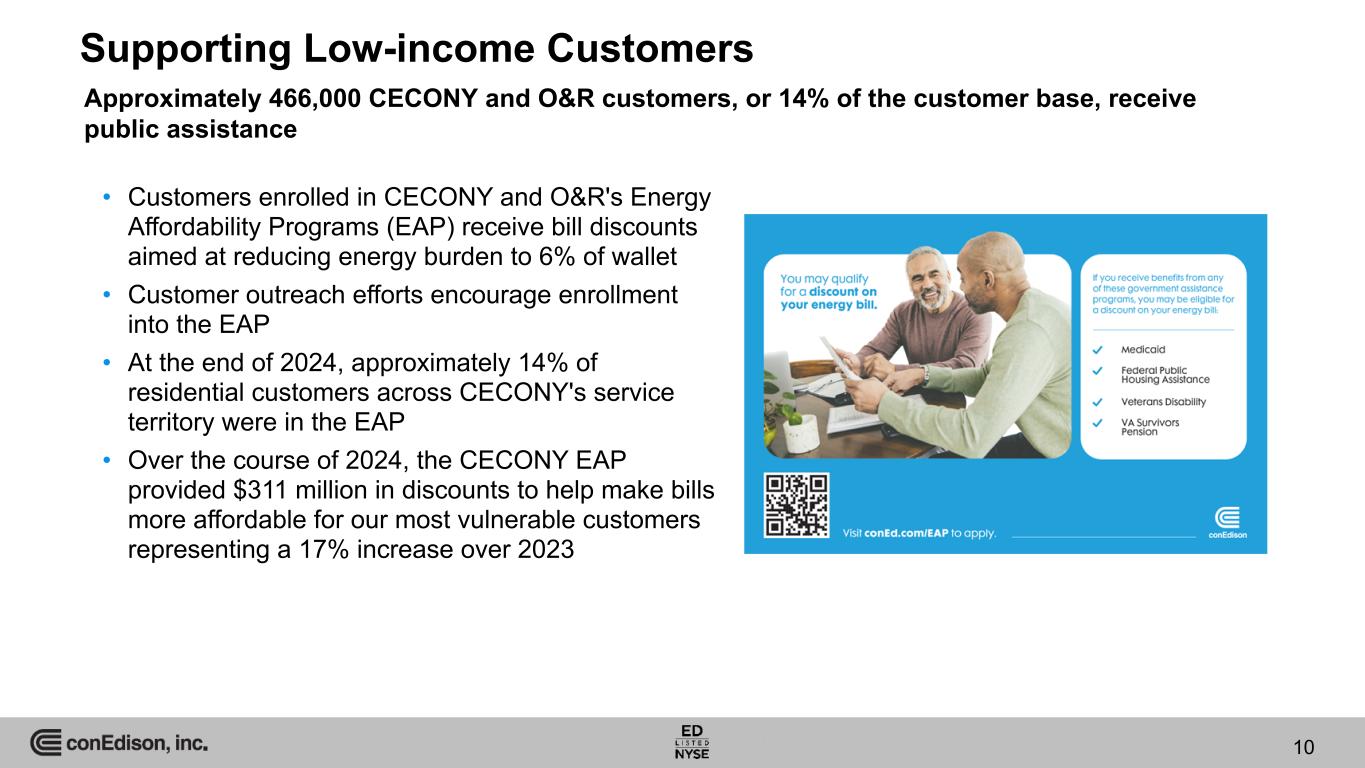 Customer Affordability CECONY electric customer bills are lower than our proxy peer average on both a total bill and share of wallet basis 9 Source: S&P Market Intelligence, EIA. Three-year (2021 - 2023) average customer bills are annualized full-service residential bills. Share of wallet calculated as annual bill over median household income.