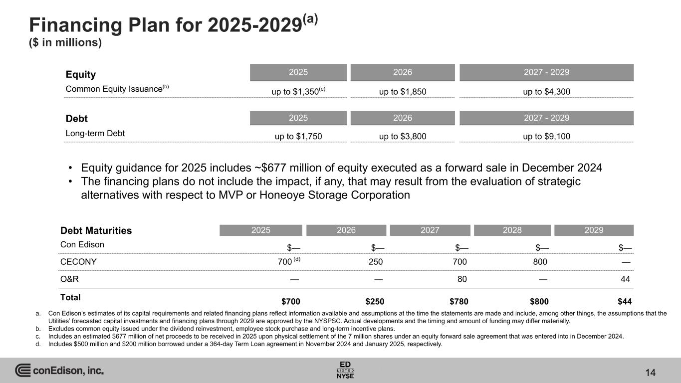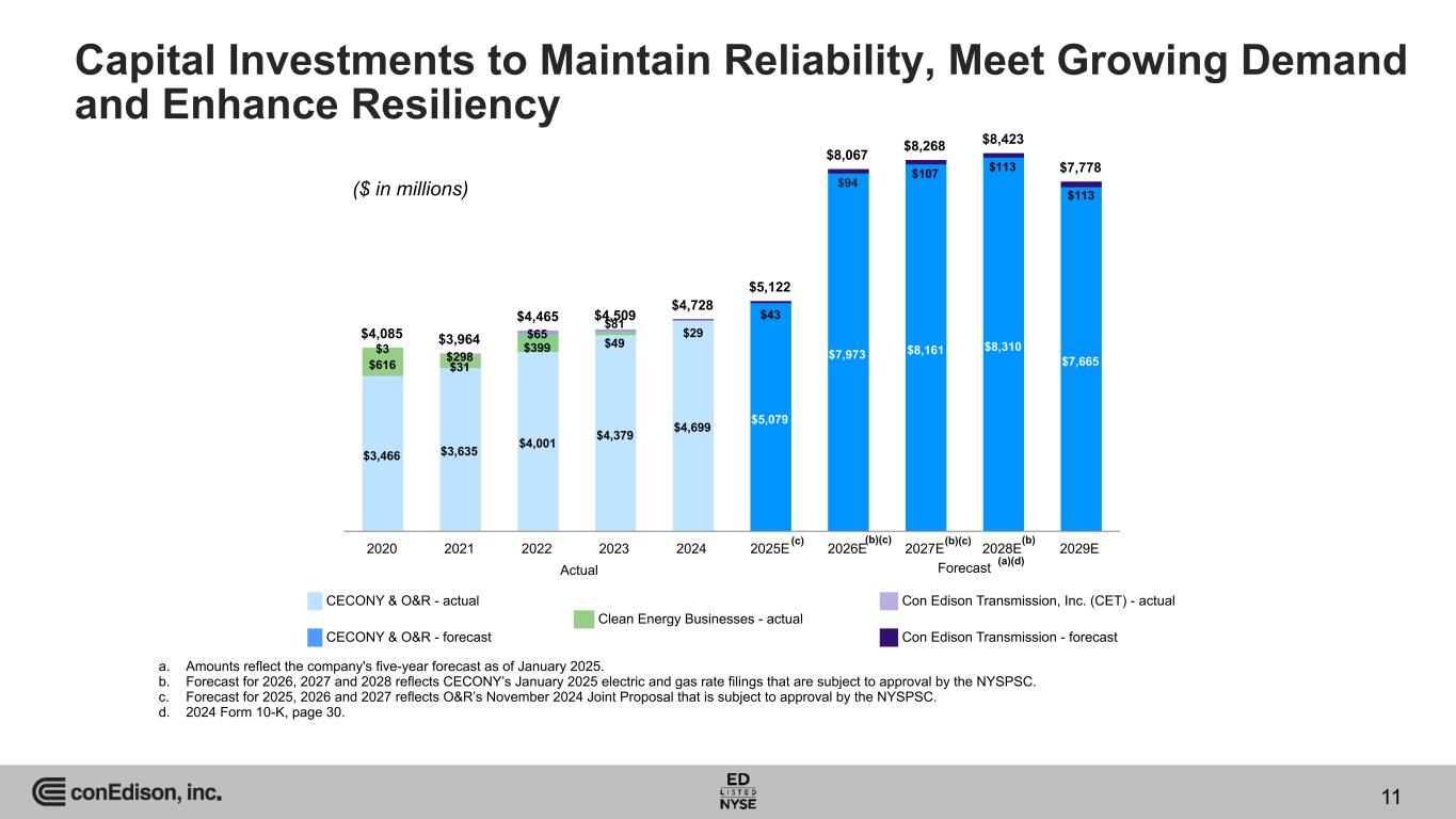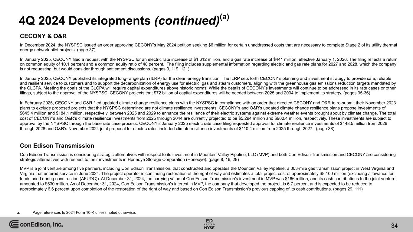 4Q 2024 Developments (continued)(a) a. Page references to 2024 Form 10-K unless noted otherwise. 34 CECONY & O&R In December 2024, the NYSPSC issued an order approving CECONY’s May 2024 petition seeking $6 million for certain unaddressed costs that are necessary to complete Stage 2 of its utility thermal energy network pilot projects. (page 37). In January 2025, CECONY filed a request with the NYSPSC for an electric rate increase of $1,612 million, and a gas rate increase of $441 million, effective January 1, 2026. The filing reflects a return on common equity of 10.1 percent and a common equity ratio of 48 percent. The filing includes supplemental information regarding electric and gas rate plans for 2027 and 2028, which the company is not requesting, but would consider through settlement discussions. (pages 9, 119, 121) In January 2025, CECONY published its integrated long-range plan (ILRP) for the clean energy transition. The ILRP sets forth CECONY’s planning and investment strategy to provide safe, reliable and resilient service to customers and to support the decarbonization of energy use for electric, gas and steam customers, aligning with the greenhouse gas emissions reduction targets mandated by the CLCPA. Meeting the goals of the CLCPA will require capital expenditures above historic norms. While the details of CECONY’s investments will continue to be addressed in its rate cases or other filings, subject to the approval of the NYSPSC, CECONY projects that $72 billion of capital expenditures will be needed between 2025 and 2034 to implement its strategy. (pages 35-36) In February 2025, CECONY and O&R filed updated climate change resilience plans with the NYSPSC in compliance with an order that directed CECONY and O&R to re-submit their November 2023 plans to exclude proposed projects that the NYSPSC determined are not climate resilience investments. CECONY’s and O&R’s updated climate change resilience plans propose investments of $645.4 million and $184.1 million, respectively, between 2025 and 2029 to enhance the resilience of their electric systems against extreme weather events brought about by climate change. The total cost of CECONY’s and O&R’s climate resilience investments from 2025 through 2044 are currently projected to be $5,294 million and $900.4 million, respectively. These investments are subject to approval by the NYSPSC through the base rate case process. CECONY’s January 2025 electric rate case filing requested approval for climate resilience investments of $448.5 million from 2026 through 2028 and O&R’s November 2024 joint proposal for electric rates included climate resilience investments of $110.4 million from 2025 through 2027. (page 38) Con Edison Transmission Con Edison Transmission is considering strategic alternatives with respect to its investment in Mountain Valley Pipeline, LLC (MVP) and both Con Edison Transmission and CECONY are considering strategic alternatives with respect to their investments in Honeoye Storage Corporation (Honeoye). (page 8, 16, 29) MVP is a joint venture among five partners, including Con Edison Transmission, that constructed and operates the Mountain Valley Pipeline, a 303-mile gas transmission project in West Virginia and Virginia that entered service in June 2024. The project operator is continuing restoration of the right of way and estimates a total project cost of approximately $8,100 million (excluding allowance for funds used during construction (AFUDC)). At December 31, 2024, the carrying value of Con Edison Transmission's investment in MVP was $166 million, and its cash contributions to the joint venture amounted to $530 million. As of December 31, 2024, Con Edison Transmission's interest in MVP, the company that developed the project, is 6.7 percent and is expected to be reduced to approximately 6.6 percent upon completion of the restoration of the right of way and based on Con Edison Transmission's previous capping of its cash contributions. (pages 29, 111)