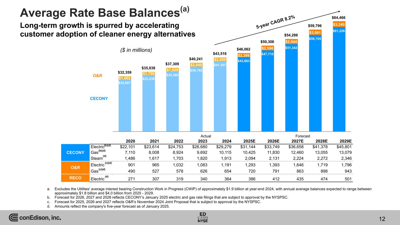 Capital Investments to Maintain Reliability, Meet Growing Demand and Enhance Resiliency $4,085 $3,964 $4,465 $4,509 $4,728 $5,122 $8,067 $8,268 $8,423 $7,778 $3,466 $3,635 $4,001 $4,379 $4,699 $5,079 $7,973 $8,161 $8,310 $7,665$616 $298 $399 $81 $3 $31 $65 $49 $29 $43 $94 $107 $113 $113 2020 2021 2022 2023 2024 2025E 2026E 2027E 2028E 2029E Actual Forecast (a)(d) CECONY & O&R - actual Con Edison Transmission, Inc. (CET) - actual Clean Energy Businesses - actual CECONY & O&R - forecast Con Edison Transmission - forecast a. Amounts reflect the company's five-year forecast as of January 2025. b. Forecast for 2026, 2027 and 2028 reflects CECONY’s January 2025 electric and gas rate filings that are subject to approval by the NYSPSC. c. Forecast for 2025, 2026 and 2027 reflects O&R’s November 2024 Joint Proposal that is subject to approval by the NYSPSC. d. 2024 Form 10-K, page 30. ($ in millions) 11 (b)(c) (b)(c)(c) (b)