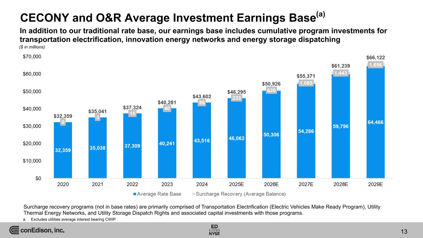 $32,359 $35,038 $37,309 $40,241 $43,516 $46,062 $50,306 $54,286 $59,796 $64,466 $30,697 $33,239 $35,380 $38,192 $41,307 $43,663 $47,710 $51,342 $56,705 $61,226 $1,662 $1,799 $1,929 $2,049 $2,209 $2,399 $2,596 $2,944 $3,091 $3,240 Average Rate Base Balances(a) O&R CECONY 5-year CAGR 8.2% 2020 2021 2022 2023 2024 2025E 2026E 2027E 2028E 2029E CECONY Electric $22,101 $23,614 $24,753 $26,680 $29,279 $31,144 $33,749 $36,658 $41,378 $45,801 Gas 7,110 8,008 8,924 9,692 10,115 10,425 11,830 12,460 13,055 13,079 Steam 1,486 1,617 1,703 1,820 1,913 2,094 2,131 2,224 2,272 2,346 O&R Electric 901 965 1,032 1,083 1,191 1,293 1,393 1,646 1,719 1,796 Gas 490 527 578 626 654 720 791 863 898 943 RECO Electric 271 307 319 340 364 386 412 435 474 501 ForecastActual a. Excludes the Utilities' average interest bearing Construction Work in Progress (CWIP) of approximately $1.9 billion at year-end 2024, with annual average balances expected to range between approximately $1.8 billion and $4.0 billion from 2025 - 2029. b. Forecast for 2026, 2027 and 2028 reflects CECONY’s January 2025 electric and gas rate filings that are subject to approval by the NYSPSC. c. Forecast for 2025, 2026 and 2027 reflects O&R’s November 2024 Joint Proposal that is subject to approval by the NYSPSC. d. Amounts reflect the company's five-year forecast as of January 2025. . (c)(d) (c)(d) (d) (b)(d) (b)(d) (d) ($ in millions) 12 Long-term growth is spurred by accelerating customer adoption of cleaner energy alternatives