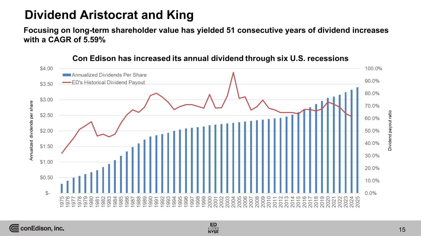Financing Plan for 2025-2029(a) ($ in millions) Equity 2025 2026 2027 - 2029 Common Equity Issuance(b) up to $1,350(c) up to $1,850 up to $4,300 Debt 2025 2026 2027 - 2029 Long-term Debt up to $1,750 up to $3,800 up to $9,100 a. Con Edison’s estimates of its capital requirements and related financing plans reflect information available and assumptions at the time the statements are made and include, among other things, the assumptions that the Utilities’ forecasted capital investments and financing plans through 2029 are approved by the NYSPSC. Actual developments and the timing and amount of funding may differ materially. b. Excludes common equity issued under the dividend reinvestment, employee stock purchase and long-term incentive plans. c. Includes an estimated $677 million of net proceeds to be received in 2025 upon physical settlement of the 7 million shares under an equity forward sale agreement that was entered into in December 2024. d. Includes $500 million and $200 million borrowed under a 364-day Term Loan agreement in November 2024 and January 2025, respectively. Debt Maturities 2025 2026 2027 2028 2029 Con Edison $— $— $— $— $— CECONY 700 (d) 250 700 800 — O&R — — 80 — 44 Total $700 $250 $780 $800 $44 14 • Equity guidance for 2025 includes ~$677 million of equity executed as a forward sale in December 2024 • The financing plans do not include the impact, if any, that may result from the evaluation of strategic alternatives with respect to MVP or Honeoye Storage Corporation