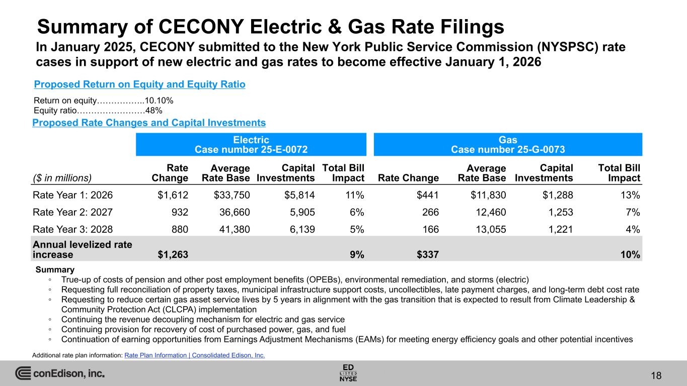 17 Utility Regulation in New York State 17 • Revenue predictability ◦ Revenue decoupling mechanism in place for CECONY and O&R electric and gas ◦ Weather normalization adjustment in CECONY steam rate plan began November 1, 2023 • Formulaic approach to return on equity ◦ 2/3 Discounted Cash Flow Model ◦ 1/3 Capital Asset Pricing Model • Reduced regulatory lag ◦ Fully-forecasted rate case test year ◦ Timely recovery of most fuel and commodity costs ◦ True-ups (reconciliations) for major costs including pensions, environmental costs, property taxes (partial), and variable-rate debt