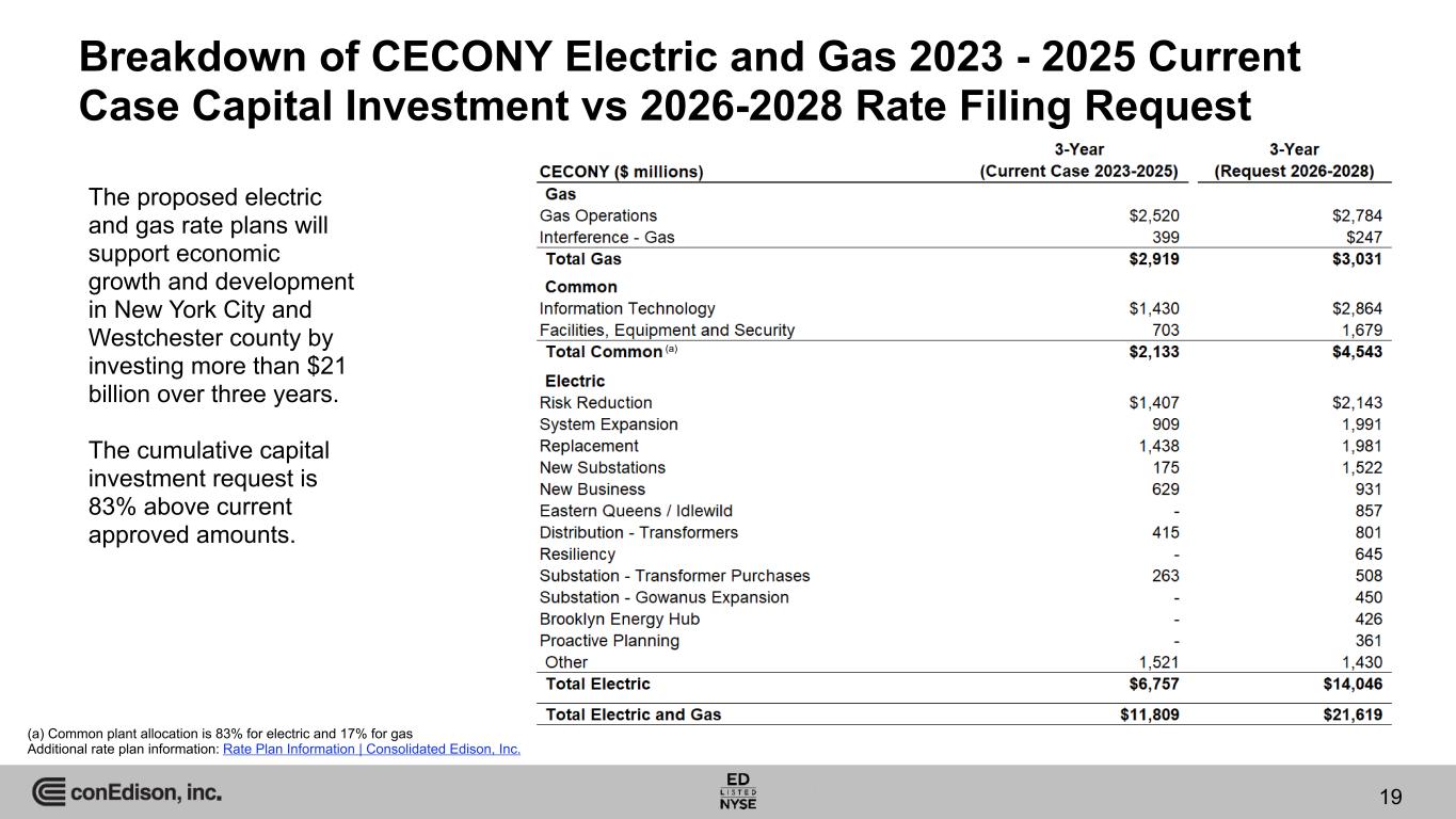 18 18 Summary of CECONY Electric & Gas Rate Filings Additional rate plan information: Rate Plan Information | Consolidated Edison, Inc. Electric Case number 25-E-0072 Gas Case number 25-G-0073 ($ in millions) Rate Change Average Rate Base Capital Investments Total Bill Impact Rate Change Average Rate Base Capital Investments Total Bill Impact Rate Year 1: 2026 $1,612 $33,750 $5,814 11% $441 $11,830 $1,288 13% Rate Year 2: 2027 932 36,660 5,905 6% 266 12,460 1,253 7% Rate Year 3: 2028 880 41,380 6,139 5% 166 13,055 1,221 4% Annual levelized rate increase $1,263 9% $337 10% In January 2025, CECONY submitted to the New York Public Service Commission (NYSPSC) rate cases in support of new electric and gas rates to become effective January 1, 2026 Summary ◦ True-up of costs of pension and other post employment benefits (OPEBs), environmental remediation, and storms (electric) ◦ Requesting full reconciliation of property taxes, municipal infrastructure support costs, uncollectibles, late payment charges, and long-term debt cost rate ◦ Requesting to reduce certain gas asset service lives by 5 years in alignment with the gas transition that is expected to result from Climate Leadership & Community Protection Act (CLCPA) implementation ◦ Continuing the revenue decoupling mechanism for electric and gas service ◦ Continuing provision for recovery of cost of purchased power, gas, and fuel ◦ Continuation of earning opportunities from Earnings Adjustment Mechanisms (EAMs) for meeting energy efficiency goals and other potential incentives Return on equity……………..10.10% Equity ratio……………………48% Proposed Return on Equity and Equity Ratio Proposed Rate Changes and Capital Investments
