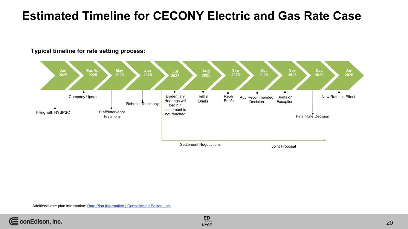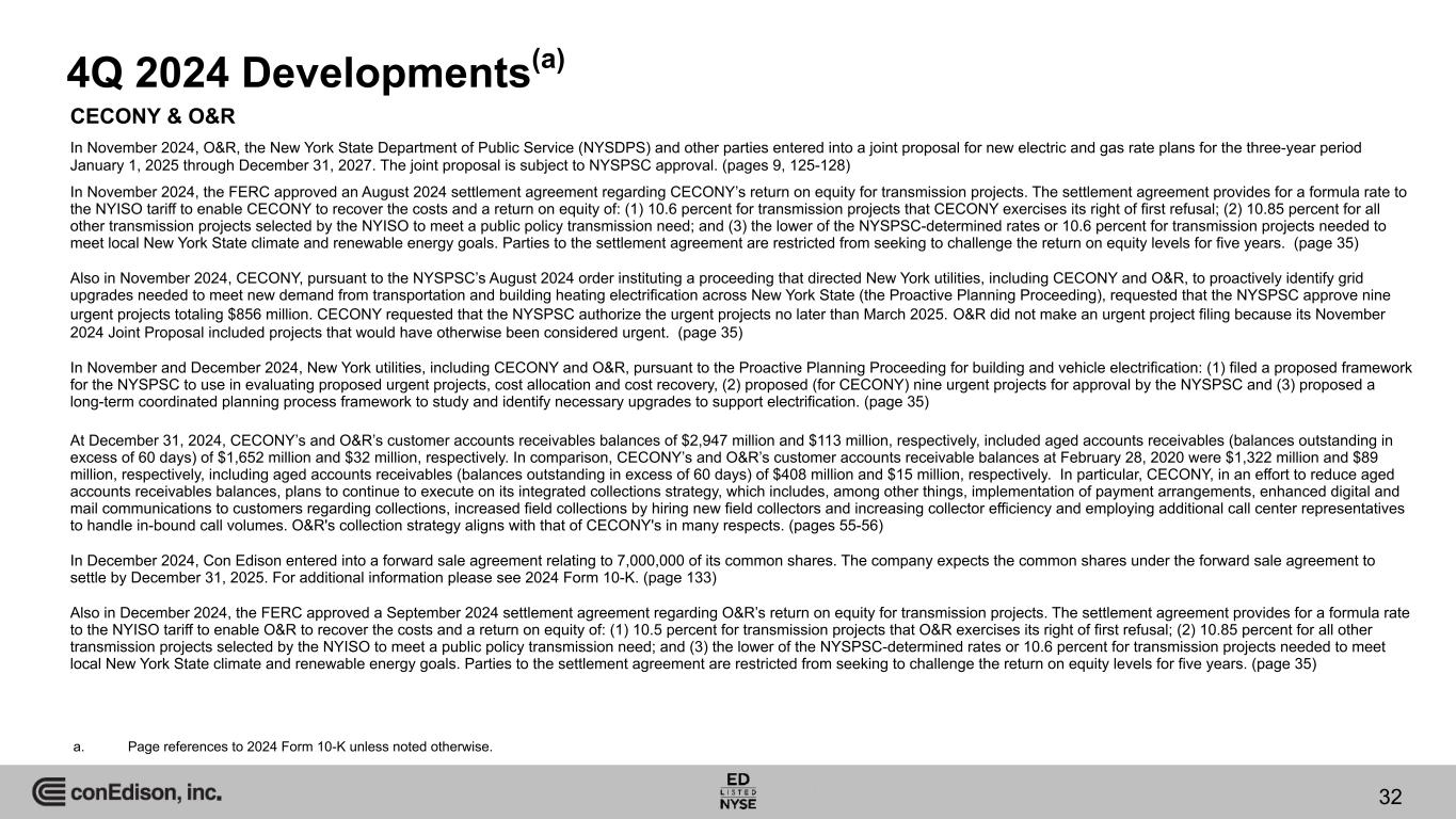4Q 2024 Developments(a) CECONY & O&R In November 2024, O&R, the New York State Department of Public Service (NYSDPS) and other parties entered into a joint proposal for new electric and gas rate plans for the three-year period January 1, 2025 through December 31, 2027. The joint proposal is subject to NYSPSC approval. (pages 9, 125-128) In November 2024, the FERC approved an August 2024 settlement agreement regarding CECONY’s return on equity for transmission projects. The settlement agreement provides for a formula rate to the NYISO tariff to enable CECONY to recover the costs and a return on equity of: (1) 10.6 percent for transmission projects that CECONY exercises its right of first refusal; (2) 10.85 percent for all other transmission projects selected by the NYISO to meet a public policy transmission need; and (3) the lower of the NYSPSC-determined rates or 10.6 percent for transmission projects needed to meet local New York State climate and renewable energy goals. Parties to the settlement agreement are restricted from seeking to challenge the return on equity levels for five years. (page 35) Also in November 2024, CECONY, pursuant to the NYSPSC’s August 2024 order instituting a proceeding that directed New York utilities, including CECONY and O&R, to proactively identify grid upgrades needed to meet new demand from transportation and building heating electrification across New York State (the Proactive Planning Proceeding), requested that the NYSPSC approve nine urgent projects totaling $856 million. CECONY requested that the NYSPSC authorize the urgent projects no later than March 2025. O&R did not make an urgent project filing because its November 2024 Joint Proposal included projects that would have otherwise been considered urgent. (page 35) In November and December 2024, New York utilities, including CECONY and O&R, pursuant to the Proactive Planning Proceeding for building and vehicle electrification: (1) filed a proposed framework for the NYSPSC to use in evaluating proposed urgent projects, cost allocation and cost recovery, (2) proposed (for CECONY) nine urgent projects for approval by the NYSPSC and (3) proposed a long-term coordinated planning process framework to study and identify necessary upgrades to support electrification. (page 35) At December 31, 2024, CECONY’s and O&R’s customer accounts receivables balances of $2,947 million and $113 million, respectively, included aged accounts receivables (balances outstanding in excess of 60 days) of $1,652 million and $32 million, respectively. In comparison, CECONY’s and O&R’s customer accounts receivable balances at February 28, 2020 were $1,322 million and $89 million, respectively, including aged accounts receivables (balances outstanding in excess of 60 days) of $408 million and $15 million, respectively. In particular, CECONY, in an effort to reduce aged accounts receivables balances, plans to continue to execute on its integrated collections strategy, which includes, among other things, implementation of payment arrangements, enhanced digital and mail communications to customers regarding collections, increased field collections by hiring new field collectors and increasing collector efficiency and employing additional call center representatives to handle in-bound call volumes. O&R's collection strategy aligns with that of CECONY's in many respects. (pages 55-56) In December 2024, Con Edison entered into a forward sale agreement relating to 7,000,000 of its common shares. The company expects the common shares under the forward sale agreement to settle by December 31, 2025. For additional information please see 2024 Form 10-K. (page 133) Also in December 2024, the FERC approved a September 2024 settlement agreement regarding O&R’s return on equity for transmission projects. The settlement agreement provides for a formula rate to the NYISO tariff to enable O&R to recover the costs and a return on equity of: (1) 10.5 percent for transmission projects that O&R exercises its right of first refusal; (2) 10.85 percent for all other transmission projects selected by the NYISO to meet a public policy transmission need; and (3) the lower of the NYSPSC-determined rates or 10.6 percent for transmission projects needed to meet local New York State climate and renewable energy goals. Parties to the settlement agreement are restricted from seeking to challenge the return on equity levels for five years. (page 35) a. Page references to 2024 Form 10-K unless noted otherwise. 32