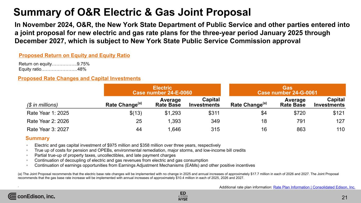 Additional rate plan information: Rate Plan Information | Consolidated Edison, Inc. O&R Electric & Gas Rate Case Filing Comparison(a) 22 Electric Gas ($ in millions) Case number 24-E-0060 Case number 24-G-0061 Rate Year 1: Jan 2025 - Dec 2025 Jan 2024 Filing Apr 2024 Update May 2024 Staff/ Intervenor Testimony Nov 2024 Joint Proposal Jan 2024 Filing Apr 2024 Update May 2024 Staff/ Intervenor Testimony Nov 2024 Joint Proposal New infrastructure investment, including return, depreciation and property taxes $17 $14 $11 $13 $6 $7 $7 $10 ROE/Financing 15 15 7 8 7 8 4 4 Depreciation changes due to proposed rates 2 2 (1) — 9 10 1 — Sales revenue change (9) (9) (15) (13) 4 5 4 4 Operations & maintenance expenses 8 8 (8) (1) (5) (5) (10) (6) Regulatory amortization (10) (11) (12) (11) (8) (8) (8) (8) Other revenues (7) (7) (7) (7) — — — — Income taxes 2 (1) (2) (2) 1 — (1) — Total Rate Increase (Decrease) $18 $11 $(27) $(13) $14 $17 $(3) $4 Rate Base $1,324 $1,305 $1,286 $1,293 $695 $711 $707 $720 ROE 10.25% 10.25% 9.50% 9.75% 10.25% 10.25% 9.50% 9.75% Equity Ratio 50% 50% 48% 48% 50% 50% 48% 48% (a) The Joint Proposal is subject to approval by the NYSPSC .