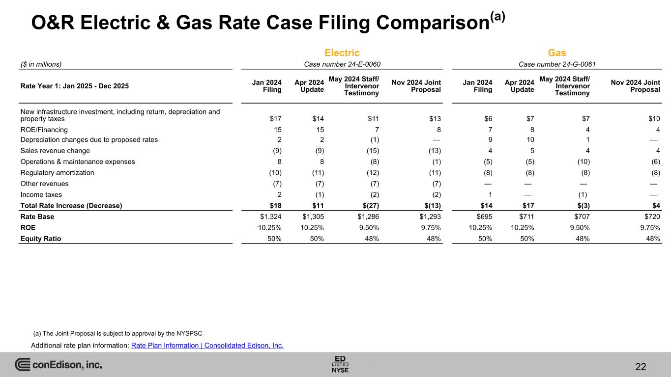 INTERNAL Summary of O&R Electric & Gas Joint Proposal Return on equity……………..9.75% Equity ratio……………………48% Proposed Rate Changes and Capital Investments Proposed Return on Equity and Equity Ratio Electric Case number 24-E-0060 Gas Case number 24-G-0061 ($ in millions) Rate Change(a) Average Rate Base Capital Investments Rate Change(a) Average Rate Base Capital Investments Rate Year 1: 2025 $(13) $1,293 $311 $4 $720 $121 Rate Year 2: 2026 25 1,393 349 18 791 127 Rate Year 3: 2027 44 1,646 315 16 863 110 Summary ◦ Electric and gas capital investment of $975 million and $358 million over three years, respectively ◦ True up of costs for pension and OPEBs, environmental remediation, major storms, and low-income bill credits ◦ Partial true-up of property taxes, uncollectibles, and late payment charges ◦ Continuation of decoupling of electric and gas revenues from electric and gas consumption ◦ Continuation of earnings opportunities from Earnings Adjustment Mechanisms (EAMs) and other positive incentives In November 2024, O&R, the New York State Department of Public Service and other parties entered into a joint proposal for new electric and gas rate plans for the three-year period January 2025 through December 2027, which is subject to New York State Public Service Commission approval Additional rate plan information: Rate Plan Information | Consolidated Edison, Inc. 21 (a) The Joint Proposal recommends that the electric base rate changes will be implemented with no change in 2025 and annual increases of approximately $17.7 million in each of 2026 and 2027. The Joint Proposal recommends that the gas base rate increase will be implemented with annual increases of approximately $10.4 million in each of 2025, 2026 and 2027. .