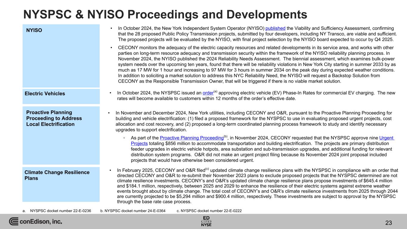 NYSPSC & NYISO Proceedings and Developments NYISO 23 a. NYSPSC docket number 22-E-0236 • In October 2024, the New York Independent System Operator (NYISO) published the Viability and Sufficiency Assessment, confirming that the 28 proposed Public Policy Transmission projects, submitted by four developers, including NY Transco, are viable and sufficient. The proposed projects will be evaluated by the NYISO, with final project selection by the NYISO board expected to occur by Q4 2025. • CECONY monitors the adequacy of the electric capacity resources and related developments in its service area, and works with other parties on long-term resource adequacy and transmission security within the framework of the NYISO reliability planning process. In November 2024, the NYISO published the 2024 Reliability Needs Assessment. The biennial assessment, which examines bulk-power system needs over the upcoming ten years, found that there will be reliability violations in New York City starting in summer 2033 by as much as 17 MW for 1 hour and increasing to 97 MW for 3 hours in summer 2034 on the peak day during expected weather conditions. In addition to soliciting a market solution to address this NYC Reliability Need, the NYISO will request a Backstop Solution from CECONY as the Responsible Transmission Owner, that will be triggered if there is no viable market solution. Electric Vehicles • In October 2024, the NYSPSC issued an order(a) approving electric vehicle (EV) Phase-In Rates for commercial EV charging. The new rates will become available to customers within 12 months of the order’s effective date. Proactive Planning Proceeding to Address Local Electrification • In November and December 2024, New York utilities, including CECONY and O&R, pursuant to the Proactive Planning Proceeding for building and vehicle electrification: (1) filed a proposed framework for the NYSPSC to use in evaluating proposed urgent projects, cost allocation and cost recovery, and (2) proposed a long-term coordinated planning process framework to study and identify necessary upgrades to support electrification. ◦ As part of the Proactive Planning Proceeding(b), in November 2024, CECONY requested that the NYSPSC approve nine Urgent Projects totaling $856 million to accommodate transportation and building electrification. The projects are primary distribution feeder upgrades in electric vehicle hotpots, area substation and sub-transmission upgrades, and additional funding for relevant distribution system programs. O&R did not make an urgent project filing because its November 2024 joint proposal included projects that would have otherwise been considered urgent. Climate Change Resilience Plans • In February 2025, CECONY and O&R filed(c) updated climate change resilience plans with the NYSPSC in compliance with an order that directed CECONY and O&R to re-submit their November 2023 plans to exclude proposed projects that the NYSPSC determined are not climate resilience investments. CECONY’s and O&R’s updated climate change resilience plans propose investments of $645.4 million and $184.1 million, respectively, between 2025 and 2029 to enhance the resilience of their electric systems against extreme weather events brought about by climate change. The total cost of CECONY’s and O&R’s climate resilience investments from 2025 through 2044 are currently projected to be $5,294 million and $900.4 million, respectively. These investments are subject to approval by the NYSPSC through the base rate case process. b. NYSPSC docket number 24-E-0364 c. NYSPSC docket number 22-E-0222