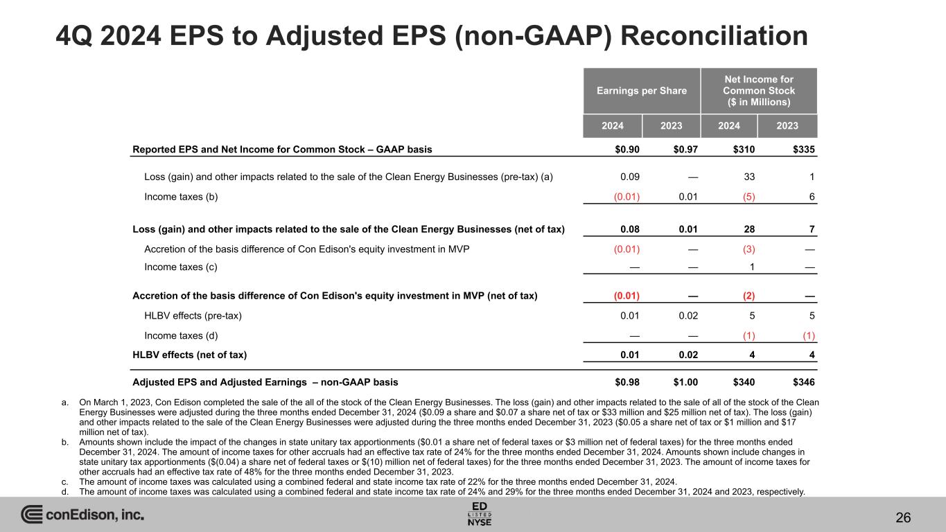 Dividend and Earnings Announcements • On January 16, 2025, the company declared a quarterly dividend of 85 cents a share on its common stock. • On February 20, 2025, the company issued a press release forecasting its adjusted earnings per share for the year 2024 to be in the range of $5.50 to $5.70 a share.(a) Reported EPS (GAAP) Adjusted EPS (Non-GAAP) $0.90 $0.97 $0.98 $1.00 2024 2023 2024 2023 4Q 2024 vs. 4Q 2023 Reported EPS (GAAP) Adjusted EPS (Non-GAAP) $5.26 $7.25 $5.40 $5.07 2024 2023 2024 2023 2024 vs. 2023 25 a. Con Edison’s forecast of adjusted earnings per share for the year of 2025 excludes accretion of the basis difference of Con Edison's equity investment in MVP (approximately $(0.03) a share after-tax) and adjustments to the gain and other impacts related to the sale of all of the stock of the Clean Energy Businesses in 2023 and impacts resulting from the evaluation of strategic alternatives with respect to MVP and Honeoye Storage Corporation (Honeoye), the amounts of which, if any, will not be determinable until year-end. Accordingly, the company is unable to provide equivalent measures determined in accordance with generally accepted accounting principles in the United States of America (GAAP). b. Adjusted earnings and adjusted earnings per share in 2024 exclude adjustments to the gain and other impacts related to the sale of all of the stock of Con Edison's former subsidiary, Con Edison Clean Energy Businesses, Inc. (the Clean Energy Businesses) in 2023 and the effects of hypothetical liquidation at book value (HLBV) accounting for tax equity investments. Adjusted earnings and adjusted earnings per share in 2023 exclude the gain and other impacts related to the sale of all of the stock of the Clean Energy Businesses in 2023 and the effects of HLBV accounting for tax equity investments. Adjusted earnings and adjusted earnings per share in 2024 exclude accretion of the basis difference of Con Edison's equity investment in Mountain Valley Pipeline, LLC (MVP) and in 2023 exclude the net mark-to-market effects of the Clean Energy Businesses. (b) (b)