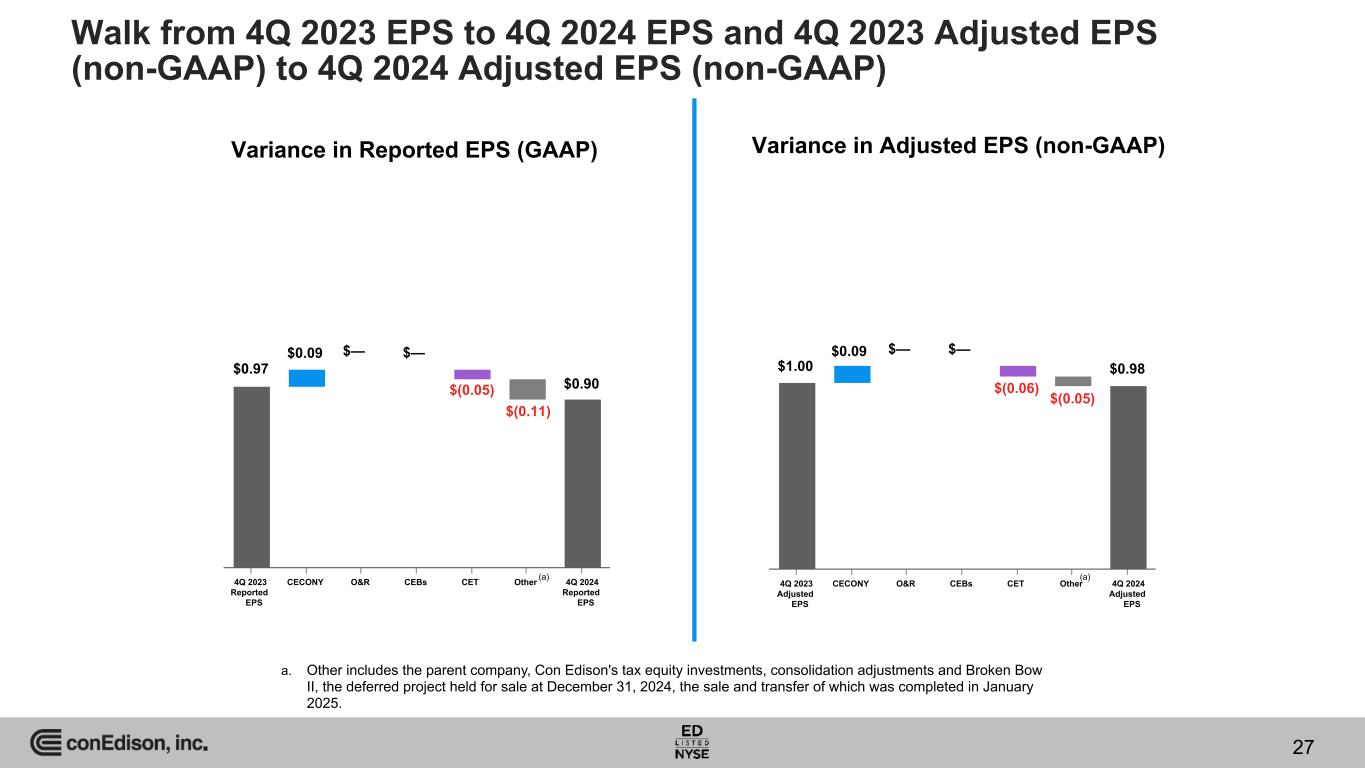4Q 2024 EPS to Adjusted EPS (non-GAAP) Reconciliation Earnings per Share Net Income for Common Stock ($ in Millions) 2024 2023 2024 2023 Reported EPS and Net Income for Common Stock – GAAP basis $0.90 $0.97 $310 $335 Loss (gain) and other impacts related to the sale of the Clean Energy Businesses (pre-tax) (a) 0.09 — 33 1 Income taxes (b) (0.01) 0.01 (5) 6 Loss (gain) and other impacts related to the sale of the Clean Energy Businesses (net of tax) 0.08 0.01 28 7 Accretion of the basis difference of Con Edison's equity investment in MVP (0.01) — (3) — Income taxes (c) — — 1 — Accretion of the basis difference of Con Edison's equity investment in MVP (net of tax) (0.01) — (2) — HLBV effects (pre-tax) 0.01 0.02 5 5 Income taxes (d) — — (1) (1) HLBV effects (net of tax) 0.01 0.02 4 4 Adjusted EPS and Adjusted Earnings – non-GAAP basis $0.98 $1.00 $340 $346 a. On March 1, 2023, Con Edison completed the sale of the all of the stock of the Clean Energy Businesses. The loss (gain) and other impacts related to the sale of all of the stock of the Clean Energy Businesses were adjusted during the three months ended December 31, 2024 ($0.09 a share and $0.07 a share net of tax or $33 million and $25 million net of tax). The loss (gain) and other impacts related to the sale of the Clean Energy Businesses were adjusted during the three months ended December 31, 2023 ($0.05 a share net of tax or $1 million and $17 million net of tax). b. Amounts shown include the impact of the changes in state unitary tax apportionments ($0.01 a share net of federal taxes or $3 million net of federal taxes) for the three months ended December 31, 2024. The amount of income taxes for other accruals had an effective tax rate of 24% for the three months ended December 31, 2024. Amounts shown include changes in state unitary tax apportionments ($(0.04) a share net of federal taxes or $(10) million net of federal taxes) for the three months ended December 31, 2023. The amount of income taxes for other accruals had an effective tax rate of 48% for the three months ended December 31, 2023. c. The amount of income taxes was calculated using a combined federal and state income tax rate of 22% for the three months ended December 31, 2024. d. The amount of income taxes was calculated using a combined federal and state income tax rate of 24% and 29% for the three months ended December 31, 2024 and 2023, respectively. 26