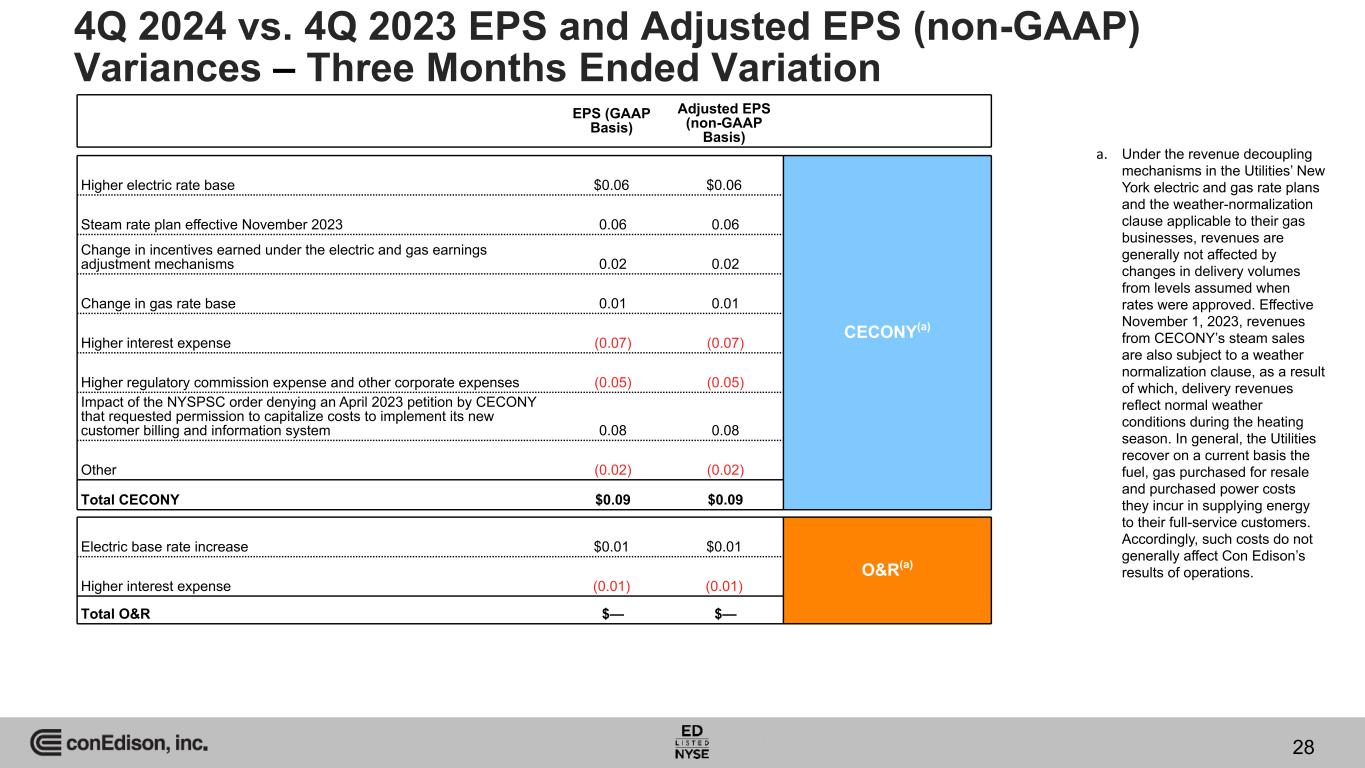 EPS (GAAP Basis) Adjusted EPS (non-GAAP Basis) Higher electric rate base $0.06 $0.06 CECONY(a) Steam rate plan effective November 2023 0.06 0.06 Change in incentives earned under the electric and gas earnings adjustment mechanisms 0.02 0.02 Change in gas rate base 0.01 0.01 Higher interest expense (0.07) (0.07) Higher regulatory commission expense and other corporate expenses (0.05) (0.05) Impact of the NYSPSC order denying an April 2023 petition by CECONY that requested permission to capitalize costs to implement its new customer billing and information system 0.08 0.08 Other (0.02) (0.02) Total CECONY $0.09 $0.09 Electric base rate increase $0.01 $0.01 O&R(a) Higher interest expense (0.01) (0.01) Total O&R $— $— 4Q 2024 vs. 4Q 2023 EPS and Adjusted EPS (non-GAAP) Variances – Three Months Ended Variation a. Under the revenue decoupling mechanisms in the Utilities’ New York electric and gas rate plans and the weather-normalization clause applicable to their gas businesses, revenues are generally not affected by changes in delivery volumes from levels assumed when rates were approved. Effective November 1, 2023, revenues from CECONY’s steam sales are also subject to a weather normalization clause, as a result of which, delivery revenues reflect normal weather conditions during the heating season. In general, the Utilities recover on a current basis the fuel, gas purchased for resale and purchased power costs they incur in supplying energy to their full-service customers. Accordingly, such costs do not generally affect Con Edison’s results of operations. 28
