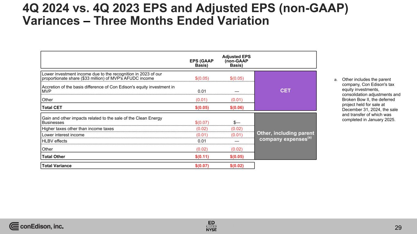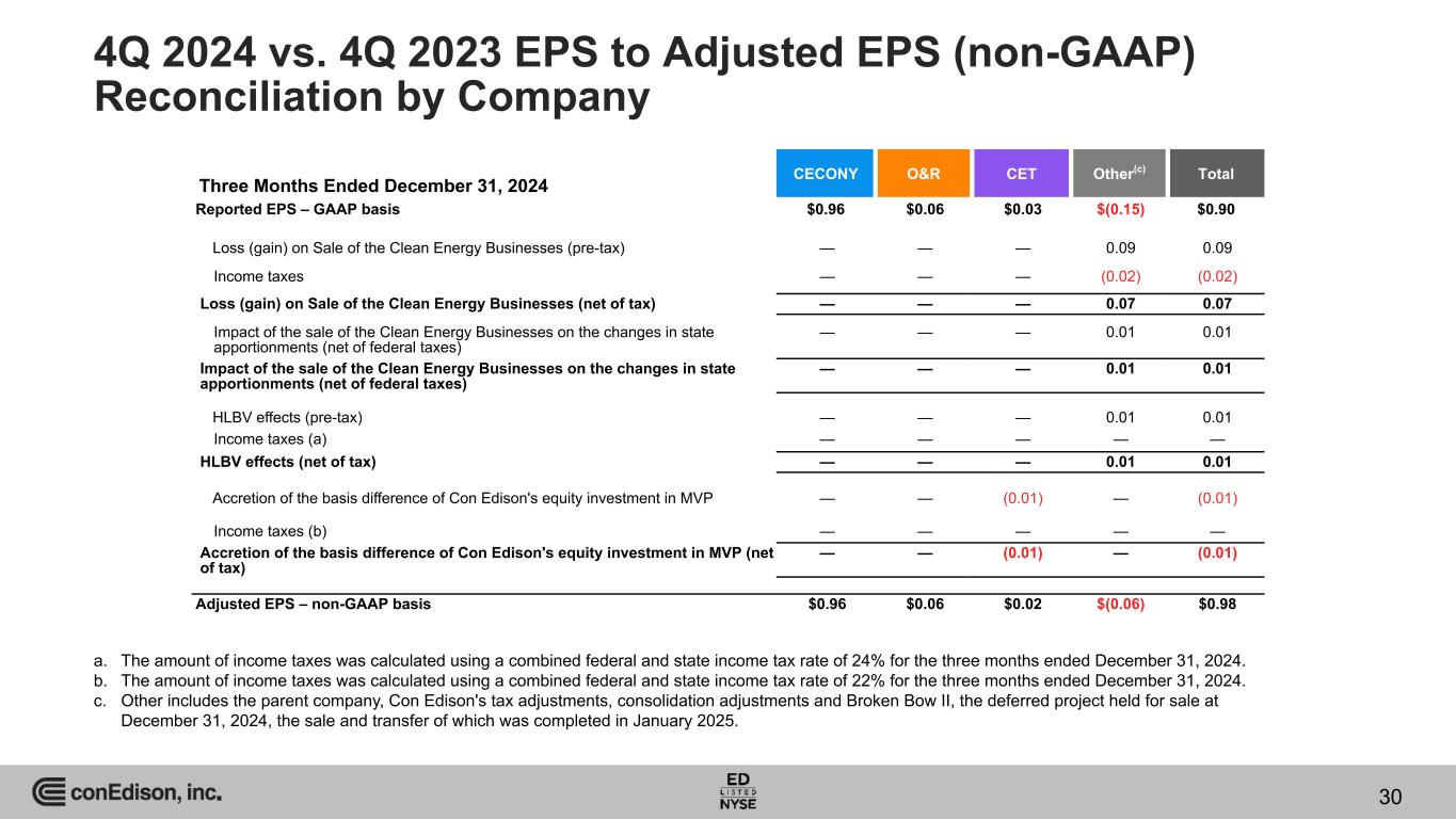 EPS (GAAP Basis) Adjusted EPS (non-GAAP Basis) Lower investment income due to the recognition in 2023 of our proportionate share ($33 million) of MVP's AFUDC income $(0.05) $(0.05) CET Accretion of the basis difference of Con Edison's equity investment in MVP 0.01 — Other (0.01) (0.01) Total CET $(0.05) $(0.06) Gain and other impacts related to the sale of the Clean Energy Businesses $(0.07) $— Other, including parent company expenses(a) Higher taxes other than income taxes (0.02) (0.02) Lower interest income (0.01) (0.01) HLBV effects 0.01 — Other (0.02) (0.02) Total Other $(0.11) $(0.05) Total Variance $(0.07) $(0.02) 4Q 2024 vs. 4Q 2023 EPS and Adjusted EPS (non-GAAP) Variances – Three Months Ended Variation 29 a. Other includes the parent company, Con Edison's tax equity investments, consolidation adjustments and Broken Bow II, the deferred project held for sale at December 31, 2024, the sale and transfer of which was completed in January 2025.
