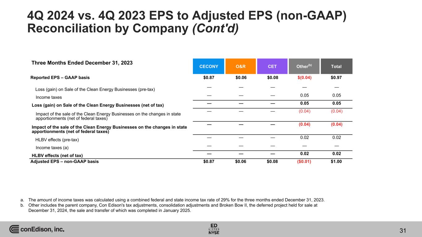 4Q 2024 vs. 4Q 2023 EPS to Adjusted EPS (non-GAAP) Reconciliation by Company CECONY O&R CET Other(c) Total Reported EPS – GAAP basis $0.96 $0.06 $0.03 $(0.15) $0.90 Loss (gain) on Sale of the Clean Energy Businesses (pre-tax) — — — 0.09 0.09 Income taxes — — — (0.02) (0.02) Loss (gain) on Sale of the Clean Energy Businesses (net of tax) — — — 0.07 0.07 Impact of the sale of the Clean Energy Businesses on the changes in state apportionments (net of federal taxes) — — — 0.01 0.01 Impact of the sale of the Clean Energy Businesses on the changes in state apportionments (net of federal taxes) — — — 0.01 0.01 HLBV effects (pre-tax) — — — 0.01 0.01 Income taxes (a) — — — — — HLBV effects (net of tax) — — — 0.01 0.01 Accretion of the basis difference of Con Edison's equity investment in MVP — — (0.01) — (0.01) Income taxes (b) — — — — — Accretion of the basis difference of Con Edison's equity investment in MVP (net of tax) — — (0.01) — (0.01) Adjusted EPS – non-GAAP basis $0.96 $0.06 $0.02 $(0.06) $0.98 Three Months Ended December 31, 2024 a. The amount of income taxes was calculated using a combined federal and state income tax rate of 24% for the three months ended December 31, 2024. b. The amount of income taxes was calculated using a combined federal and state income tax rate of 22% for the three months ended December 31, 2024. c. Other includes the parent company, Con Edison's tax adjustments, consolidation adjustments and Broken Bow II, the deferred project held for sale at December 31, 2024, the sale and transfer of which was completed in January 2025. 30