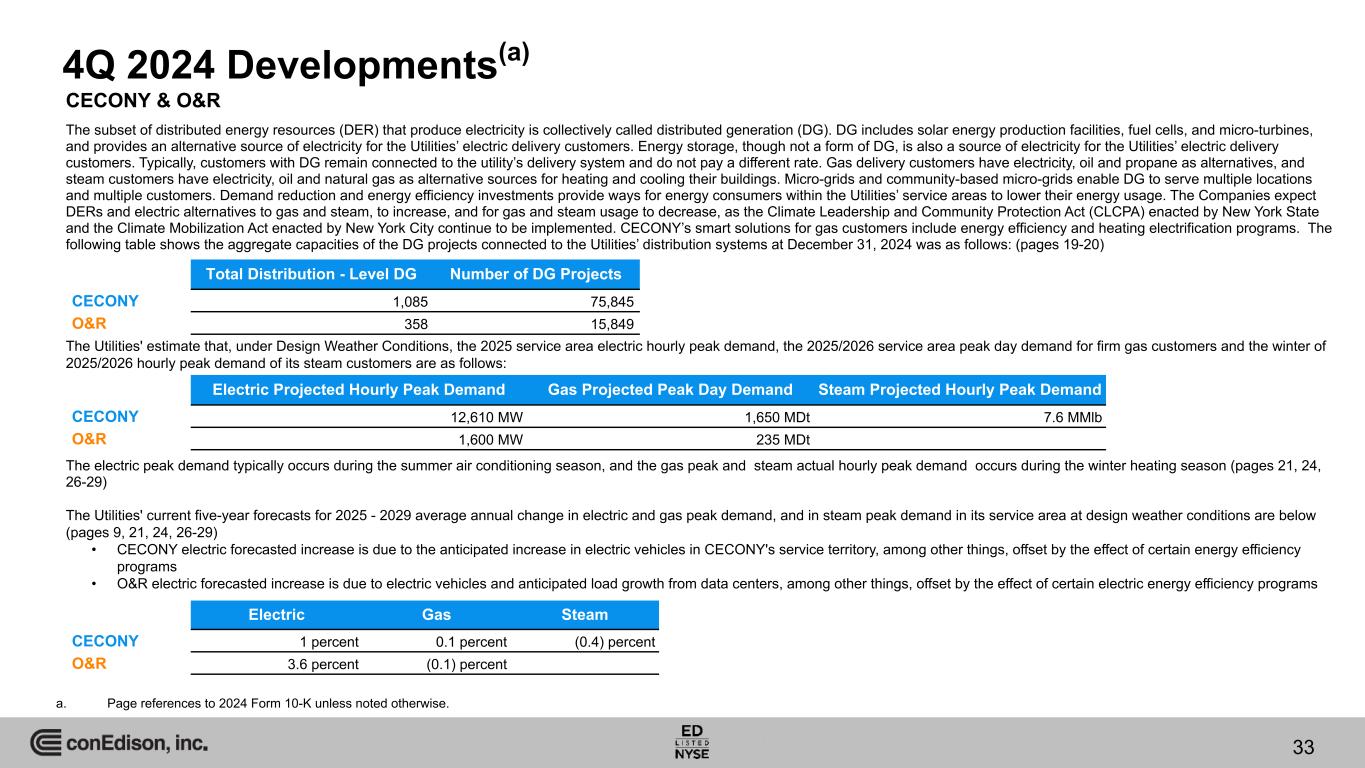 4Q 2024 Developments(a) CECONY & O&R The subset of distributed energy resources (DER) that produce electricity is collectively called distributed generation (DG). DG includes solar energy production facilities, fuel cells, and micro-turbines, and provides an alternative source of electricity for the Utilities’ electric delivery customers. Energy storage, though not a form of DG, is also a source of electricity for the Utilities’ electric delivery customers. Typically, customers with DG remain connected to the utility’s delivery system and do not pay a different rate. Gas delivery customers have electricity, oil and propane as alternatives, and steam customers have electricity, oil and natural gas as alternative sources for heating and cooling their buildings. Micro-grids and community-based micro-grids enable DG to serve multiple locations and multiple customers. Demand reduction and energy efficiency investments provide ways for energy consumers within the Utilities’ service areas to lower their energy usage. The Companies expect DERs and electric alternatives to gas and steam, to increase, and for gas and steam usage to decrease, as the Climate Leadership and Community Protection Act (CLCPA) enacted by New York State and the Climate Mobilization Act enacted by New York City continue to be implemented. CECONY’s smart solutions for gas customers include energy efficiency and heating electrification programs. The following table shows the aggregate capacities of the DG projects connected to the Utilities’ distribution systems at December 31, 2024 was as follows: (pages 19-20) The Utilities' estimate that, under Design Weather Conditions, the 2025 service area electric hourly peak demand, the 2025/2026 service area peak day demand for firm gas customers and the winter of 2025/2026 hourly peak demand of its steam customers are as follows: The electric peak demand typically occurs during the summer air conditioning season, and the gas peak and steam actual hourly peak demand occurs during the winter heating season (pages 21, 24, 26-29) The Utilities' current five-year forecasts for 2025 - 2029 average annual change in electric and gas peak demand, and in steam peak demand in its service area at design weather conditions are below (pages 9, 21, 24, 26-29) • CECONY electric forecasted increase is due to the anticipated increase in electric vehicles in CECONY's service territory, among other things, offset by the effect of certain energy efficiency programs • O&R electric forecasted increase is due to electric vehicles and anticipated load growth from data centers, among other things, offset by the effect of certain electric energy efficiency programs 33 Total Distribution - Level DG Number of DG Projects CECONY 1,085 75,845 O&R 358 15,849 Electric Projected Hourly Peak Demand Gas Projected Peak Day Demand Steam Projected Hourly Peak Demand CECONY 12,610 MW 1,650 MDt 7.6 MMlb O&R 1,600 MW 235 MDt Electric Gas Steam CECONY 1 percent 0.1 percent (0.4) percent O&R 3.6 percent (0.1) percent a. Page references to 2024 Form 10-K unless noted otherwise.