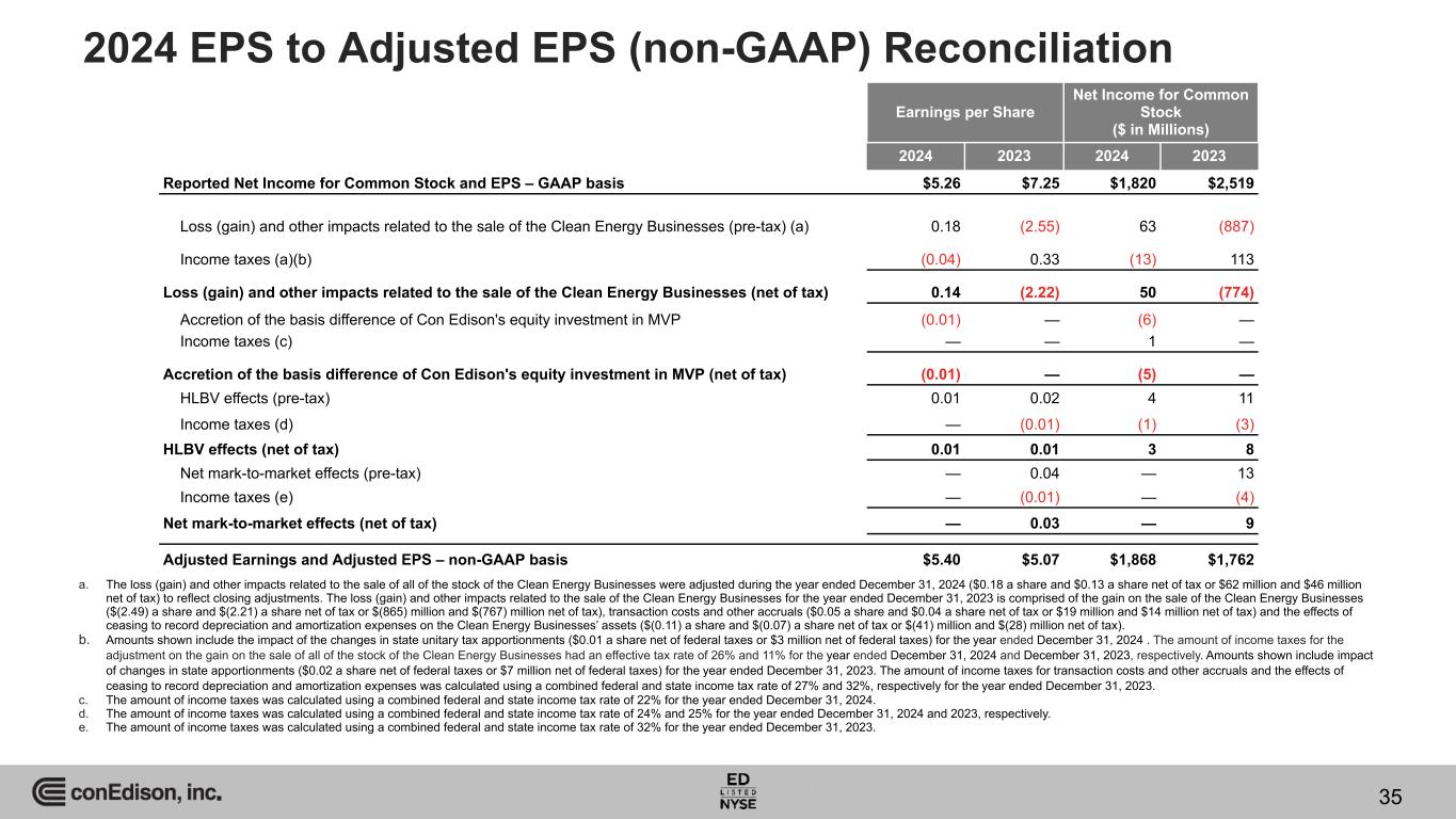 2024 EPS to Adjusted EPS (non-GAAP) Reconciliation Earnings per Share Net Income for Common Stock ($ in Millions) 2024 2023 2024 2023 Reported Net Income for Common Stock and EPS – GAAP basis $5.26 $7.25 $1,820 $2,519 Loss (gain) and other impacts related to the sale of the Clean Energy Businesses (pre-tax) (a) 0.18 (2.55) 63 (887) Income taxes (a)(b) (0.04) 0.33 (13) 113 Loss (gain) and other impacts related to the sale of the Clean Energy Businesses (net of tax) 0.14 (2.22) 50 (774) Accretion of the basis difference of Con Edison's equity investment in MVP (0.01) — (6) — Income taxes (c) — — 1 — Accretion of the basis difference of Con Edison's equity investment in MVP (net of tax) (0.01) — (5) — HLBV effects (pre-tax) 0.01 0.02 4 11 Income taxes (d) — (0.01) (1) (3) HLBV effects (net of tax) 0.01 0.01 3 8 Net mark-to-market effects (pre-tax) — 0.04 — 13 Income taxes (e) — (0.01) — (4) Net mark-to-market effects (net of tax) — 0.03 — 9 Adjusted Earnings and Adjusted EPS – non-GAAP basis $5.40 $5.07 $1,868 $1,762 a. The loss (gain) and other impacts related to the sale of all of the stock of the Clean Energy Businesses were adjusted during the year ended December 31, 2024 ($0.18 a share and $0.13 a share net of tax or $62 million and $46 million net of tax) to reflect closing adjustments. The loss (gain) and other impacts related to the sale of the Clean Energy Businesses for the year ended December 31, 2023 is comprised of the gain on the sale of the Clean Energy Businesses ($(2.49) a share and $(2.21) a share net of tax or $(865) million and $(767) million net of tax), transaction costs and other accruals ($0.05 a share and $0.04 a share net of tax or $19 million and $14 million net of tax) and the effects of ceasing to record depreciation and amortization expenses on the Clean Energy Businesses’ assets ($(0.11) a share and $(0.07) a share net of tax or $(41) million and $(28) million net of tax). b. Amounts shown include the impact of the changes in state unitary tax apportionments ($0.01 a share net of federal taxes or $3 million net of federal taxes) for the year ended December 31, 2024 . The amount of income taxes for the adjustment on the gain on the sale of all of the stock of the Clean Energy Businesses had an effective tax rate of 26% and 11% for the year ended December 31, 2024 and December 31, 2023, respectively. Amounts shown include impact of changes in state apportionments ($0.02 a share net of federal taxes or $7 million net of federal taxes) for the year ended December 31, 2023. The amount of income taxes for transaction costs and other accruals and the effects of ceasing to record depreciation and amortization expenses was calculated using a combined federal and state income tax rate of 27% and 32%, respectively for the year ended December 31, 2023. c. The amount of income taxes was calculated using a combined federal and state income tax rate of 22% for the year ended December 31, 2024. d. The amount of income taxes was calculated using a combined federal and state income tax rate of 24% and 25% for the year ended December 31, 2024 and 2023, respectively. e. The amount of income taxes was calculated using a combined federal and state income tax rate of 32% for the year ended December 31, 2023. 35