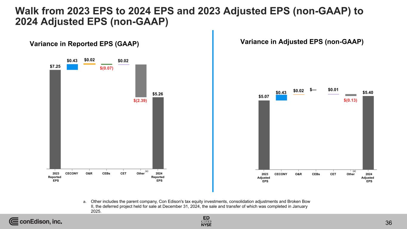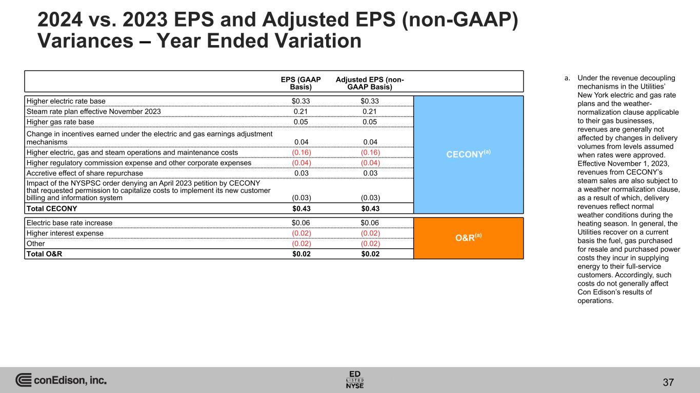 2023 Adjusted EPS CECONY O&R CEBs CET Other 2024 Adjusted EPS Variance in Reported EPS (GAAP) Variance in Adjusted EPS (non-GAAP) 2023 Reported EPS CECONY O&R CEBs CET Other 2024 Reported EPS $7.25 $0.43 $0.02 $(0.07) $0.02 $(2.39) $5.26 $5.07 $0.43 $0.02 $— $0.01 $(0.13) $5.40 (a) (a) a. Other includes the parent company, Con Edison's tax equity investments, consolidation adjustments and Broken Bow II, the deferred project held for sale at December 31, 2024, the sale and transfer of which was completed in January 2025. Walk from 2023 EPS to 2024 EPS and 2023 Adjusted EPS (non-GAAP) to 2024 Adjusted EPS (non-GAAP) 36