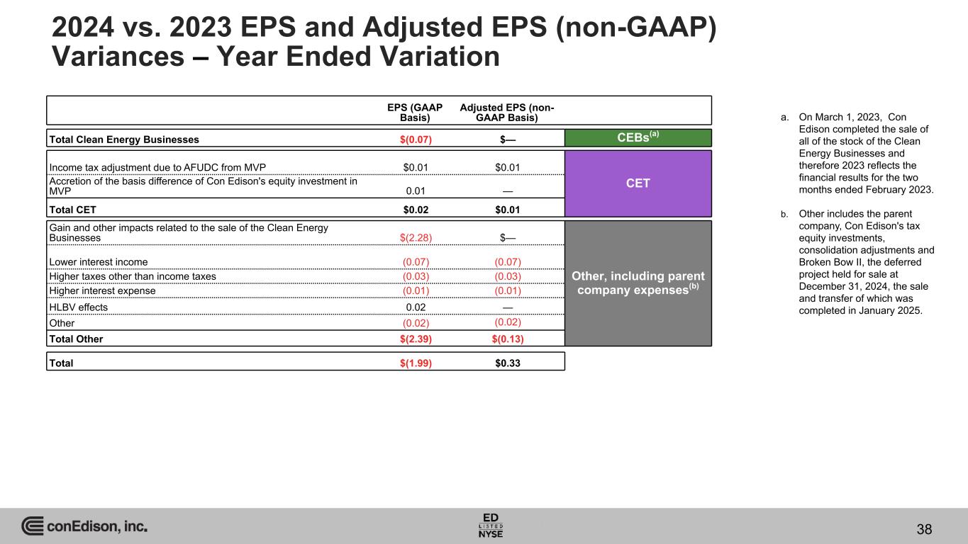 EPS (GAAP Basis) Adjusted EPS (non- GAAP Basis) Total Clean Energy Businesses $(0.07) $— CEBs(a) Income tax adjustment due to AFUDC from MVP $0.01 $0.01 CETAccretion of the basis difference of Con Edison's equity investment in MVP 0.01 — Total CET $0.02 $0.01 Gain and other impacts related to the sale of the Clean Energy Businesses $(2.28) $— Other, including parent company expenses(b) Lower interest income (0.07) (0.07) Higher taxes other than income taxes (0.03) (0.03) Higher interest expense (0.01) (0.01) HLBV effects 0.02 — Other (0.02) (0.02) Total Other $(2.39) $(0.13) Total $(1.99) $0.33 a. On March 1, 2023, Con Edison completed the sale of all of the stock of the Clean Energy Businesses and therefore 2023 reflects the financial results for the two months ended February 2023. b. Other includes the parent company, Con Edison's tax equity investments, consolidation adjustments and Broken Bow II, the deferred project held for sale at December 31, 2024, the sale and transfer of which was completed in January 2025. 2024 vs. 2023 EPS and Adjusted EPS (non-GAAP) Variances – Year Ended Variation 38