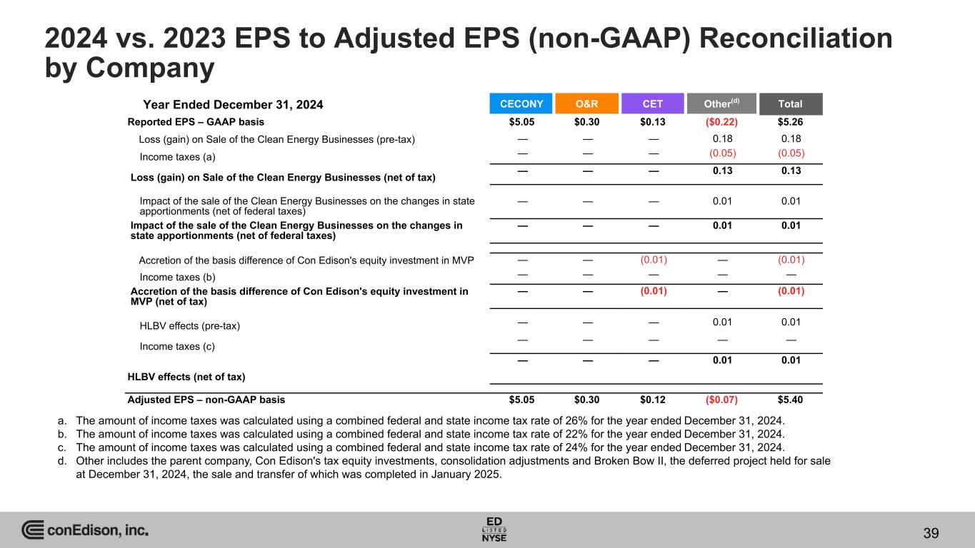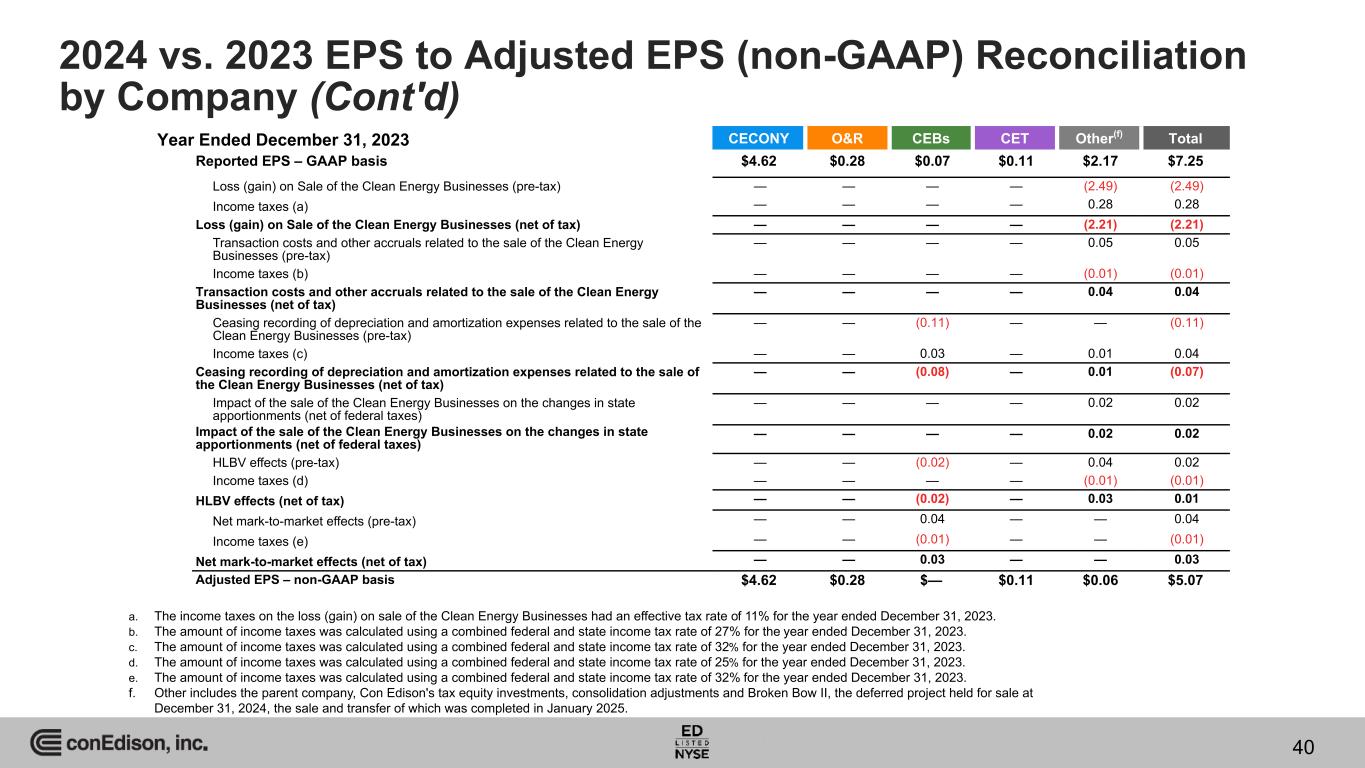2024 vs. 2023 EPS to Adjusted EPS (non-GAAP) Reconciliation by Company CECONY O&R CET Other(d) Total Reported EPS – GAAP basis $5.05 $0.30 $0.13 ($0.22) $5.26 Loss (gain) on Sale of the Clean Energy Businesses (pre-tax) — — — 0.18 0.18 Income taxes (a) — — — (0.05) (0.05) Loss (gain) on Sale of the Clean Energy Businesses (net of tax) — — — 0.13 0.13 Impact of the sale of the Clean Energy Businesses on the changes in state apportionments (net of federal taxes) — — — 0.01 0.01 Impact of the sale of the Clean Energy Businesses on the changes in state apportionments (net of federal taxes) — — — 0.01 0.01 Accretion of the basis difference of Con Edison's equity investment in MVP — — (0.01) — (0.01) Income taxes (b) — — — — — Accretion of the basis difference of Con Edison's equity investment in MVP (net of tax) — — (0.01) — (0.01) HLBV effects (pre-tax) — — — 0.01 0.01 Income taxes (c) — — — — — HLBV effects (net of tax) — — — 0.01 0.01 Adjusted EPS – non-GAAP basis $5.05 $0.30 $0.12 ($0.07) $5.40 Year Ended December 31, 2024 a. The amount of income taxes was calculated using a combined federal and state income tax rate of 26% for the year ended December 31, 2024. b. The amount of income taxes was calculated using a combined federal and state income tax rate of 22% for the year ended December 31, 2024. c. The amount of income taxes was calculated using a combined federal and state income tax rate of 24% for the year ended December 31, 2024. d. Other includes the parent company, Con Edison's tax equity investments, consolidation adjustments and Broken Bow II, the deferred project held for sale at December 31, 2024, the sale and transfer of which was completed in January 2025. 39