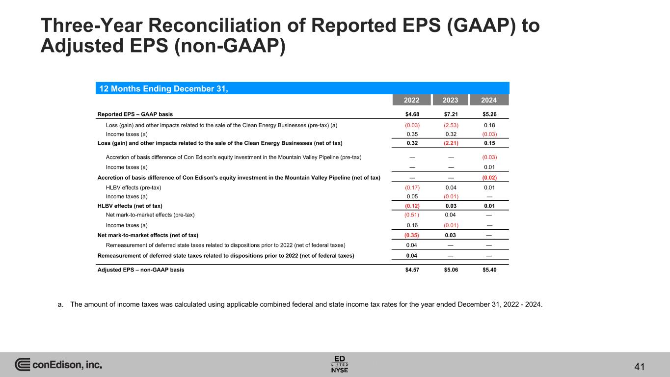 2024 vs. 2023 EPS to Adjusted EPS (non-GAAP) Reconciliation by Company (Cont'd) CECONY O&R CEBs CET Other(f) Total Reported EPS – GAAP basis $4.62 $0.28 $0.07 $0.11 $2.17 $7.25 Loss (gain) on Sale of the Clean Energy Businesses (pre-tax) — — — — (2.49) (2.49) Income taxes (a) — — — — 0.28 0.28 Loss (gain) on Sale of the Clean Energy Businesses (net of tax) — — — — (2.21) (2.21) Transaction costs and other accruals related to the sale of the Clean Energy Businesses (pre-tax) — — — — 0.05 0.05 Income taxes (b) — — — — (0.01) (0.01) Transaction costs and other accruals related to the sale of the Clean Energy Businesses (net of tax) — — — — 0.04 0.04 Ceasing recording of depreciation and amortization expenses related to the sale of the Clean Energy Businesses (pre-tax) — — (0.11) — — (0.11) Income taxes (c) — — 0.03 — 0.01 0.04 Ceasing recording of depreciation and amortization expenses related to the sale of the Clean Energy Businesses (net of tax) — — (0.08) — 0.01 (0.07) Impact of the sale of the Clean Energy Businesses on the changes in state apportionments (net of federal taxes) — — — — 0.02 0.02 Impact of the sale of the Clean Energy Businesses on the changes in state apportionments (net of federal taxes) — — — — 0.02 0.02 HLBV effects (pre-tax) — — (0.02) — 0.04 0.02 Income taxes (d) — — — — (0.01) (0.01) HLBV effects (net of tax) — — (0.02) — 0.03 0.01 Net mark-to-market effects (pre-tax) — — 0.04 — — 0.04 Income taxes (e) — — (0.01) — — (0.01) Net mark-to-market effects (net of tax) — — 0.03 — — 0.03 Adjusted EPS – non-GAAP basis $4.62 $0.28 $— $0.11 $0.06 $5.07 Year Ended December 31, 2023 a. The income taxes on the loss (gain) on sale of the Clean Energy Businesses had an effective tax rate of 11% for the year ended December 31, 2023. b. The amount of income taxes was calculated using a combined federal and state income tax rate of 27% for the year ended December 31, 2023. c. The amount of income taxes was calculated using a combined federal and state income tax rate of 32% for the year ended December 31, 2023. d. The amount of income taxes was calculated using a combined federal and state income tax rate of 25% for the year ended December 31, 2023. e. The amount of income taxes was calculated using a combined federal and state income tax rate of 32% for the year ended December 31, 2023. f. Other includes the parent company, Con Edison's tax equity investments, consolidation adjustments and Broken Bow II, the deferred project held for sale at December 31, 2024, the sale and transfer of which was completed in January 2025. 40