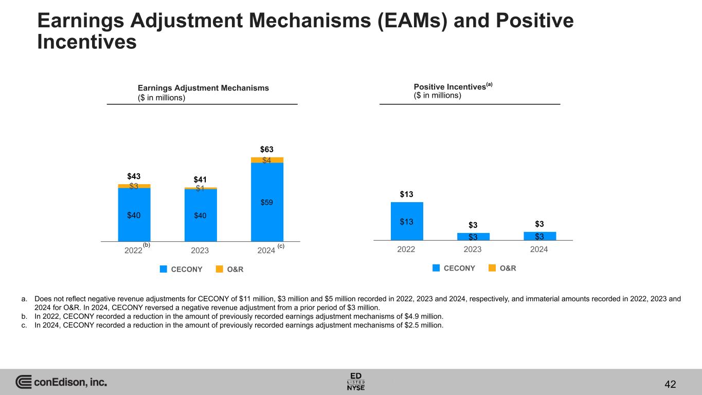 Three-Year Reconciliation of Reported EPS (GAAP) to Adjusted EPS (non-GAAP) 2022 2023 2024 Reported EPS – GAAP basis $4.68 $7.21 $5.26 Loss (gain) and other impacts related to the sale of the Clean Energy Businesses (pre-tax) (a) (0.03) (2.53) 0.18 Income taxes (a) 0.35 0.32 (0.03) Loss (gain) and other impacts related to the sale of the Clean Energy Businesses (net of tax) 0.32 (2.21) 0.15 Accretion of basis difference of Con Edison's equity investment in the Mountain Valley Pipeline (pre-tax) — — (0.03) Income taxes (a) — — 0.01 Accretion of basis difference of Con Edison's equity investment in the Mountain Valley Pipeline (net of tax) — — (0.02) HLBV effects (pre-tax) (0.17) 0.04 0.01 Income taxes (a) 0.05 (0.01) — HLBV effects (net of tax) (0.12) 0.03 0.01 Net mark-to-market effects (pre-tax) (0.51) 0.04 — Income taxes (a) 0.16 (0.01) — Net mark-to-market effects (net of tax) (0.35) 0.03 — Remeasurement of deferred state taxes related to dispositions prior to 2022 (net of federal taxes) 0.04 — — Remeasurement of deferred state taxes related to dispositions prior to 2022 (net of federal taxes) 0.04 — — Adjusted EPS – non-GAAP basis $4.57 $5.06 $5.40 12 Months Ending December 31, 41 a. The amount of income taxes was calculated using applicable combined federal and state income tax rates for the year ended December 31, 2022 - 2024.