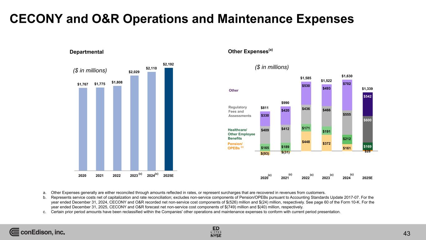 $811 $990 $1,585 $1,522 $1,630 $1,339 $(93) $(31) $448 $372 $161 $28 $165 $189 $171 $191 $212 $169 $409 $412 $436 $466 $555 $600 $330 $420 $530 $493 $702 $542 2020 2021 2022 2023 2024 2025E CECONY and O&R Operations and Maintenance Expenses a. Other Expenses generally are either reconciled through amounts reflected in rates, or represent surcharges that are recovered in revenues from customers. b. Represents service costs net of capitalization and rate reconciliation; excludes non-service components of Pension/OPEBs pursuant to Accounting Standards Update 2017-07. For the year ended December 31, 2024, CECONY and O&R recorded net non-service cost components of $(526) million and $(24) million, respectively. See page 60 of the Form 10-K. For the year ended December 31, 2025, CECONY and O&R forecast net non-service cost components of $(749) million and $(40) million, respectively. c. Certain prior period amounts have been reclassified within the Companies' other operations and maintenance expenses to conform with current period presentation. Other Expenses(a) $1,767 $1,775 $1,808 $2,029 $2,110 $2,192 2020 2021 2022 2023 2024 2025E Departmental Pension/ OPEBs (c) Regulatory Fees and Assessments Healthcare/ Other Employee Benefits Other ($ in millions) ($ in millions) 43 (c)(c) (c) (c)(c)(c) (c)