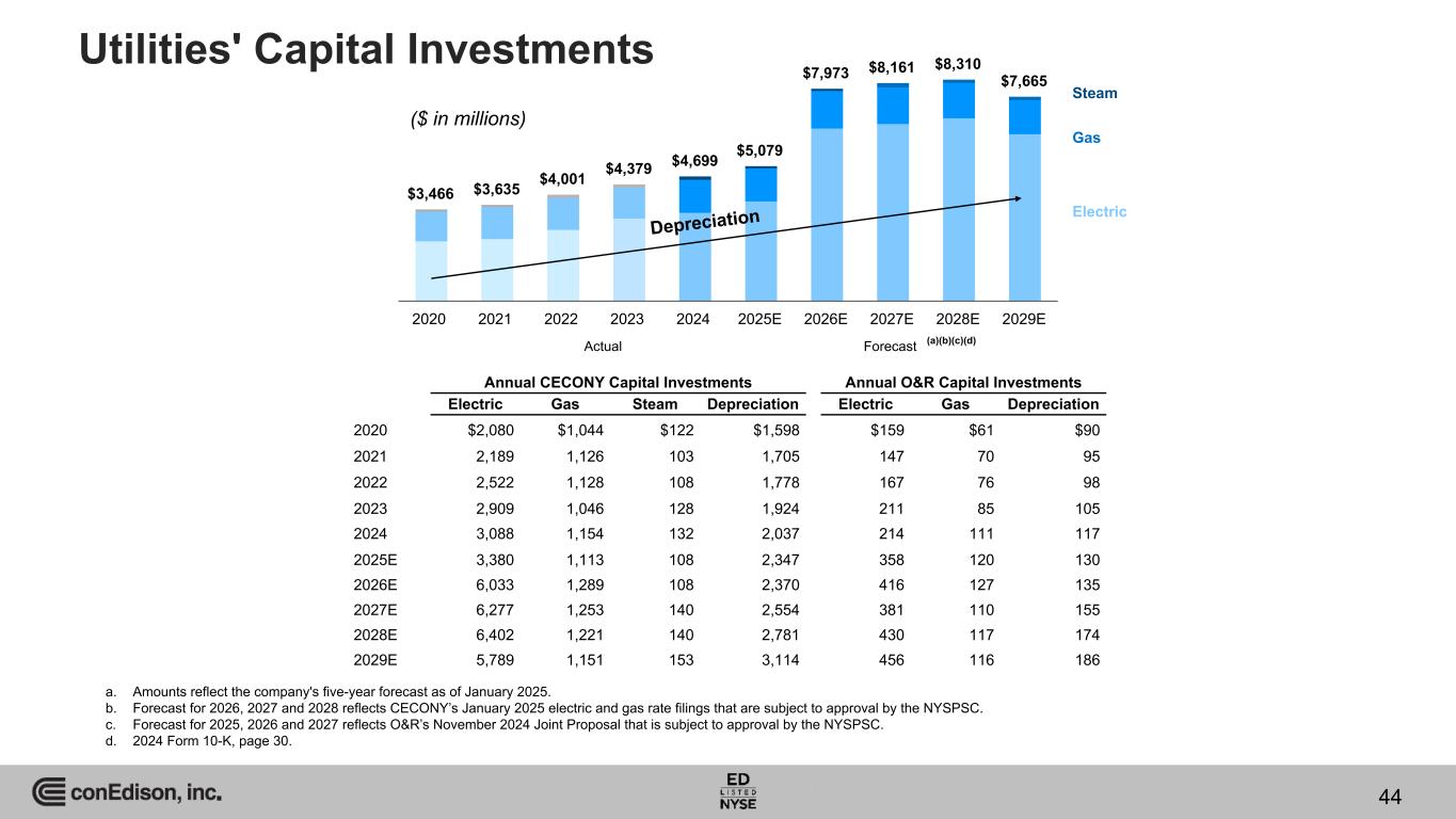 $3,466 $3,635 $4,001 $4,379 $4,699 $5,079 $7,973 $8,161 $8,310 $7,665 2020 2021 2022 2023 2024 2025E 2026E 2027E 2028E 2029E Utilities' Capital Investments Gas Electric Annual CECONY Capital Investments Annual O&R Capital Investments Electric Gas Steam Depreciation Electric Gas Depreciation 2020 $2,080 $1,044 $122 $1,598 $159 $61 $90 2021 2,189 1,126 103 1,705 147 70 95 2022 2,522 1,128 108 1,778 167 76 98 2023 2,909 1,046 128 1,924 211 85 105 2024 3,088 1,154 132 2,037 214 111 117 2025E 3,380 1,113 108 2,347 358 120 130 2026E 6,033 1,289 108 2,370 416 127 135 2027E 6,277 1,253 140 2,554 381 110 155 2028E 6,402 1,221 140 2,781 430 117 174 2029E 5,789 1,151 153 3,114 456 116 186 Steam Depreciation Actual Forecast a. Amounts reflect the company's five-year forecast as of January 2025. b. Forecast for 2026, 2027 and 2028 reflects CECONY’s January 2025 electric and gas rate filings that are subject to approval by the NYSPSC. c. Forecast for 2025, 2026 and 2027 reflects O&R’s November 2024 Joint Proposal that is subject to approval by the NYSPSC. d. 2024 Form 10-K, page 30. (a)(b)(c)(d) ($ in millions) 44