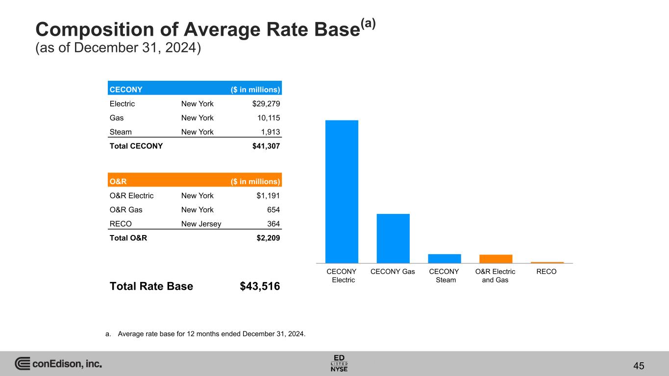 Composition of Average Rate Base(a) (as of December 31, 2024) a. Average rate base for 12 months ended December 31, 2024. CECONY ($ in millions) Electric New York $29,279 Gas New York 10,115 Steam New York 1,913 Total CECONY $41,307 O&R ($ in millions) O&R Electric New York $1,191 O&R Gas New York 654 RECO New Jersey 364 Total O&R $2,209 Total Rate Base $43,516 CECONY Electric CECONY Gas CECONY Steam O&R Electric and Gas RECO 45