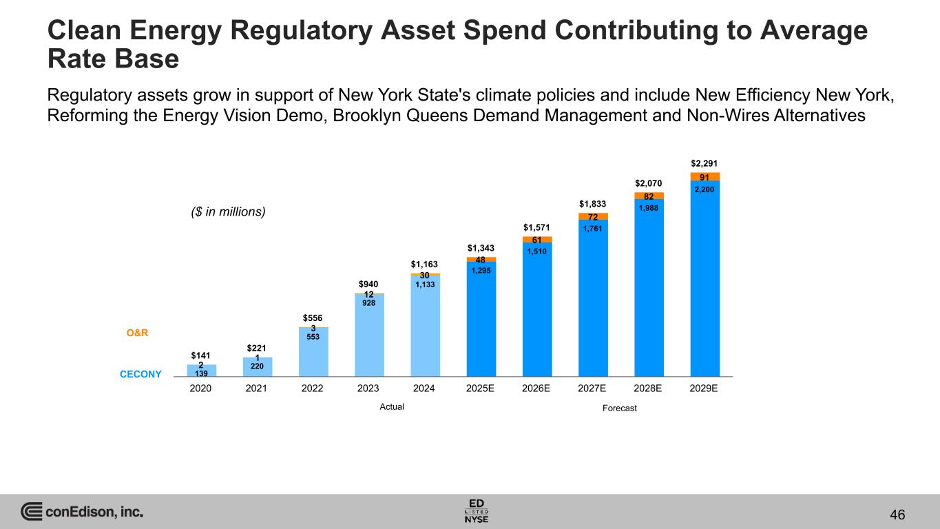 $141 $221 $556 $940 $1,163 $1,343 $1,571 $1,833 $2,070 $2,291 139 220 553 928 1,133 1,295 1,510 1,761 1,988 2,200 2 1 3 12 30 48 61 72 82 91 2020 2021 2022 2023 2024 2025E 2026E 2027E 2028E 2029E Clean Energy Regulatory Asset Spend Contributing to Average Rate Base O&R CECONY ForecastActual ($ in millions) 46 Regulatory assets grow in support of New York State's climate policies and include New Efficiency New York, Reforming the Energy Vision Demo, Brooklyn Queens Demand Management and Non-Wires Alternatives