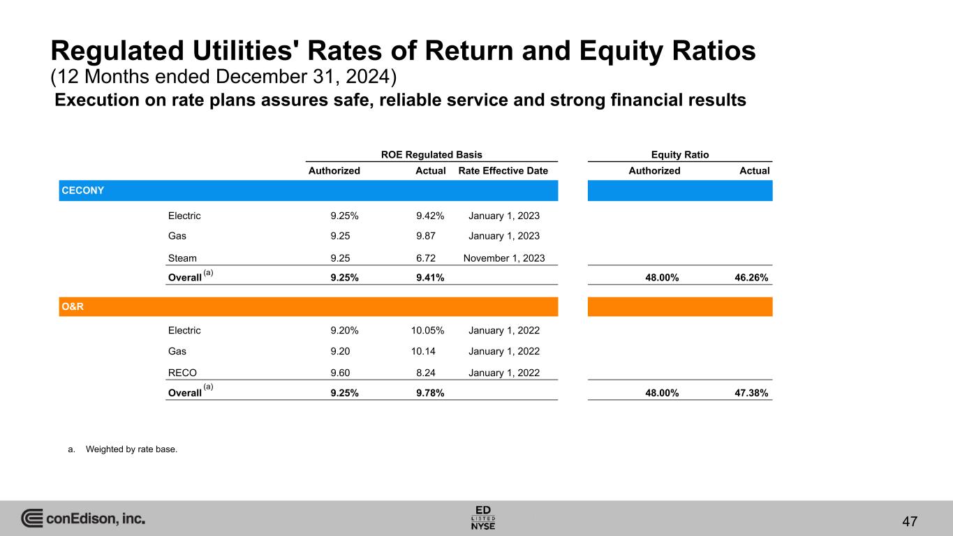 Regulated Utilities' Rates of Return and Equity Ratios (12 Months ended December 31, 2024) ROE Regulated Basis Equity Ratio Authorized Actual Rate Effective Date Authorized Actual CECONY Electric 9.25% 9.42% January 1, 2023 Gas 9.25 9.87 January 1, 2023 Steam 9.25 6.72 November 1, 2023 Overall 9.25% 9.41% 48.00% 46.26% O&R Electric 9.20% 10.05% January 1, 2022 Gas 9.20 10.14 January 1, 2022 RECO 9.60 8.24 January 1, 2022 Overall 9.25% 9.78% 48.00% 47.38% a. Weighted by rate base. (a) (a) 47 Execution on rate plans assures safe, reliable service and strong financial results