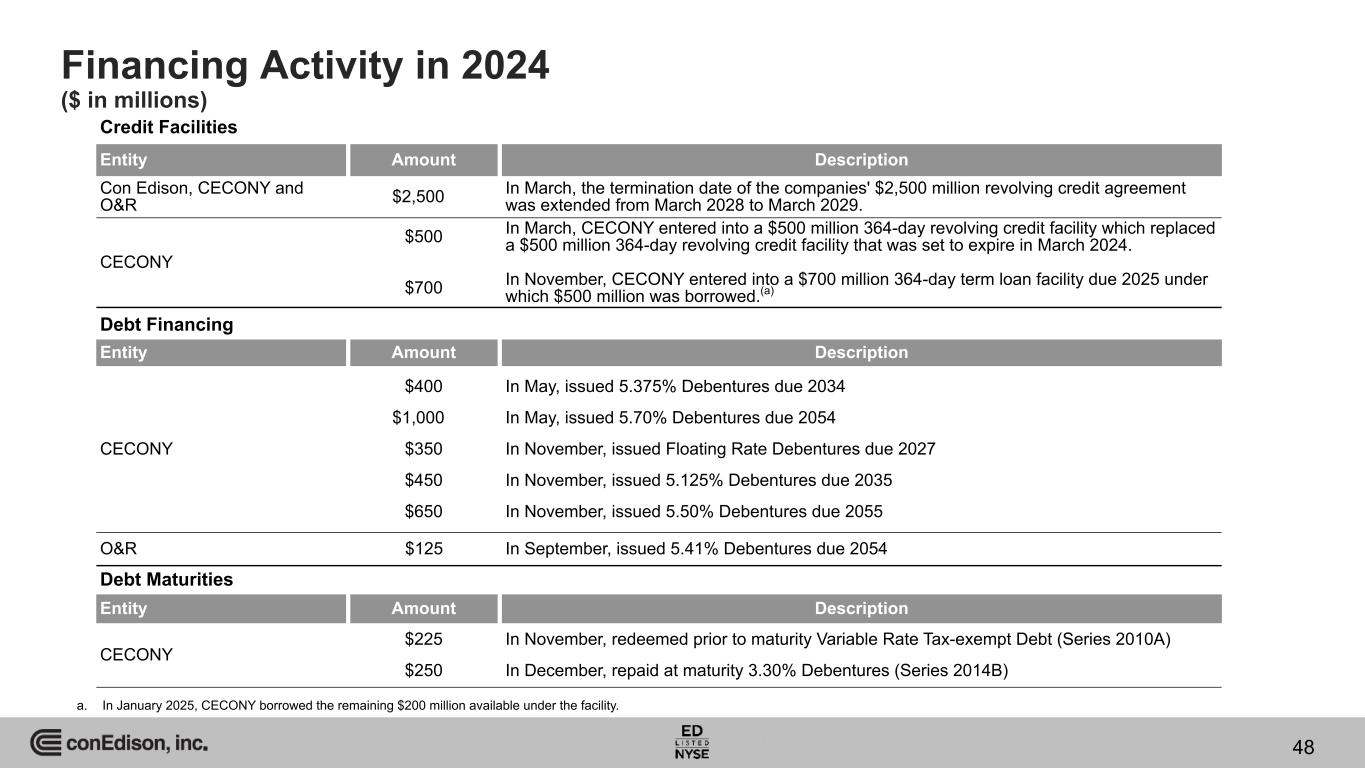 Financing Activity in 2024 ($ in millions) Credit Facilities Entity Amount Description Con Edison, CECONY and O&R $2,500 In March, the termination date of the companies' $2,500 million revolving credit agreement was extended from March 2028 to March 2029. CECONY $500 $700 In March, CECONY entered into a $500 million 364-day revolving credit facility which replaced a $500 million 364-day revolving credit facility that was set to expire in March 2024. In November, CECONY entered into a $700 million 364-day term loan facility due 2025 under which $500 million was borrowed.(a) 48 Debt Financing Entity Amount Description CECONY $400 $1,000 $350 $450 $650 In May, issued 5.375% Debentures due 2034 In May, issued 5.70% Debentures due 2054 In November, issued Floating Rate Debentures due 2027 In November, issued 5.125% Debentures due 2035 In November, issued 5.50% Debentures due 2055 O&R $125 In September, issued 5.41% Debentures due 2054 a. In January 2025, CECONY borrowed the remaining $200 million available under the facility. Debt Maturities Entity Amount Description CECONY $225 $250 In November, redeemed prior to maturity Variable Rate Tax-exempt Debt (Series 2010A) In December, repaid at maturity 3.30% Debentures (Series 2014B)