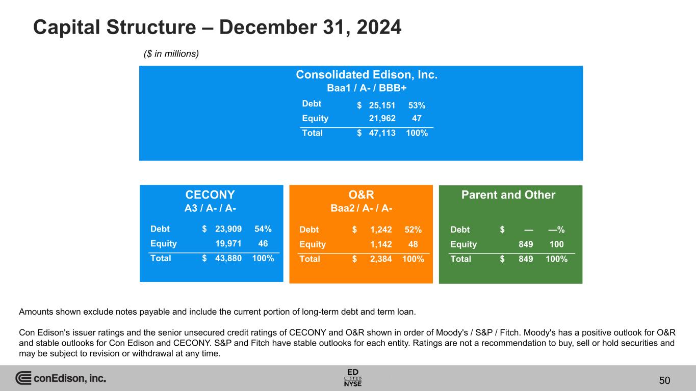 Capital Structure – December 31, 2024 Consolidated Edison, Inc. Baa1 / A- / BBB+ CECONY A3 / A- / A- O&R Baa2 / A- / A- Parent and Other Debt $ 25,151 53% Equity 21,962 47 Total $ 47,113 100% Debt $ 23,909 54% Equity 19,971 46 Total $ 43,880 100% Debt $ 1,242 52% Equity 1,142 48 Total $ 2,384 100% Debt $ — —% Equity 849 100 Total $ 849 100% Amounts shown exclude notes payable and include the current portion of long-term debt and term loan. Con Edison's issuer ratings and the senior unsecured credit ratings of CECONY and O&R shown in order of Moody's / S&P / Fitch. Moody's has a positive outlook for O&R and stable outlooks for Con Edison and CECONY. S&P and Fitch have stable outlooks for each entity. Ratings are not a recommendation to buy, sell or hold securities and may be subject to revision or withdrawal at any time. ($ in millions) 50