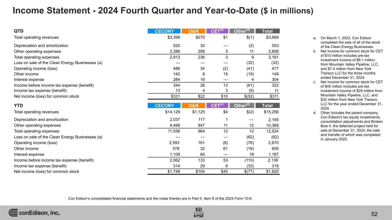 Income Statement - 2024 Fourth Quarter and Year-to-Date ($ in millions) QTD CECONY O&R CET(b) Other(d) Total Total operating revenues $3,399 $270 $1 $(1) $3,669 Depreciation and amortization 525 30 — (2) 553 Other operating expenses 2,388 206 3 11 2,608 Total operating expenses 2,913 236 3 9 3,161 Loss on sale of the Clean Energy Businesses (a) — — — (32) (32) Operating income (loss) 486 34 (2) (41) 477 Other income 142 8 15 (16) 149 Interest expense 284 16 — 4 304 Income before income tax expense (benefit) 344 26 13 (61) 322 Income tax expense (benefit) 13 4 3 (9) 11 Net income (loss) for common stock $331 $22 $10 $(52) $311 YTD CECONY O&R CET(c) Other(d) Total Total operating revenues $14,129 $1,125 $4 $(2) $15,256 Depreciation and amortization 2,037 117 1 — 2,155 Other operating expenses 9,499 847 11 12 10,369 Total operating expenses 11,536 964 12 12 12,524 Loss on sale of the Clean Energy Businesses (a) — — — (62) (62) Operating income (loss) 2,593 161 (8) (76) 2,670 Other income 578 32 61 (16) 655 Interest expense 1,109 60 — 18 1,187 Income before income tax expense (benefit) 2,062 133 53 (110) 2,138 Income tax expense (benefit) 314 29 8 (33) 318 Net income (loss) for common stock $1,748 $104 $45 $(77) $1,820 a. On March 1, 2023, Con Edison completed the sale of all of the stock of the Clean Energy Businesses. b. Net income for common stock for CET of $10 million includes pre-tax investment income of $8.1 million from Mountain Valley Pipeline, LLC, and $7.4 million from New York Transco LLC for the three months ended December 31, 2024. c. Net income for common stock for CET of $45 million includes pre-tax investment income of $29 million from Mountain Valley Pipeline, LLC, and $32 million from New York Transco LLC for the year ended December 31, 2024. d. Other includes the parent company, Con Edison's tax equity investments, consolidation adjustments and Broken Bow II, the deferred project held for sale at December 31, 2024, the sale and transfer of which was completed in January 2025. Con Edison’s consolidated financial statements and the notes thereto are in Part II, Item 8 of the 2024 Form 10-K. 52