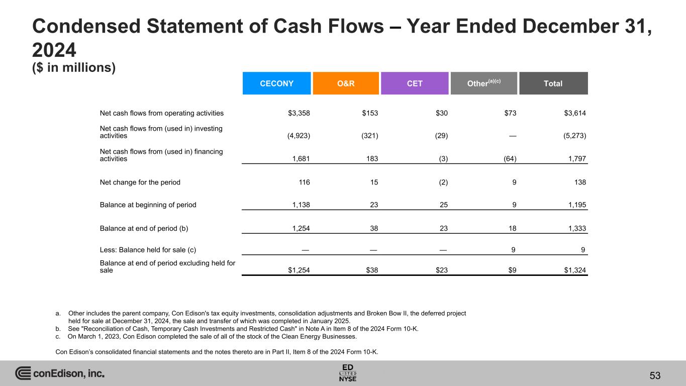 Condensed Statement of Cash Flows – Year Ended December 31, 2024 ($ in millions) CECONY O&R CET Other(a)(c) Total Net cash flows from operating activities $3,358 $153 $30 $73 $3,614 Net cash flows from (used in) investing activities (4,923) (321) (29) — (5,273) Net cash flows from (used in) financing activities 1,681 183 (3) (64) 1,797 Net change for the period 116 15 (2) 9 138 Balance at beginning of period 1,138 23 25 9 1,195 Balance at end of period (b) 1,254 38 23 18 1,333 Less: Balance held for sale (c) — — — 9 9 Balance at end of period excluding held for sale $1,254 $38 $23 $9 $1,324 a. Other includes the parent company, Con Edison's tax equity investments, consolidation adjustments and Broken Bow II, the deferred project held for sale at December 31, 2024, the sale and transfer of which was completed in January 2025. b. See "Reconciliation of Cash, Temporary Cash Investments and Restricted Cash" in Note A in Item 8 of the 2024 Form 10-K. c. On March 1, 2023, Con Edison completed the sale of all of the stock of the Clean Energy Businesses. Con Edison’s consolidated financial statements and the notes thereto are in Part II, Item 8 of the 2024 Form 10-K. 53