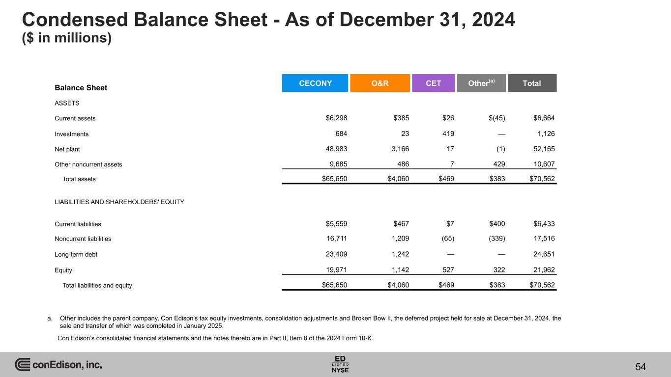 Condensed Balance Sheet - As of December 31, 2024 ($ in millions) Balance Sheet CECONY O&R CET Other(a) Total ASSETS Current assets $6,298 $385 $26 $(45) $6,664 Investments 684 23 419 — 1,126 Net plant 48,983 3,166 17 (1) 52,165 Other noncurrent assets 9,685 486 7 429 10,607 Total assets $65,650 $4,060 $469 $383 $70,562 LIABILITIES AND SHAREHOLDERS' EQUITY Current liabilities $5,559 $467 $7 $400 $6,433 Noncurrent liabilities 16,711 1,209 (65) (339) 17,516 Long-term debt 23,409 1,242 — — 24,651 Equity 19,971 1,142 527 322 21,962 Total liabilities and equity $65,650 $4,060 $469 $383 $70,562 a. Other includes the parent company, Con Edison's tax equity investments, consolidation adjustments and Broken Bow II, the deferred project held for sale at December 31, 2024, the sale and transfer of which was completed in January 2025. Con Edison’s consolidated financial statements and the notes thereto are in Part II, Item 8 of the 2024 Form 10-K. 54