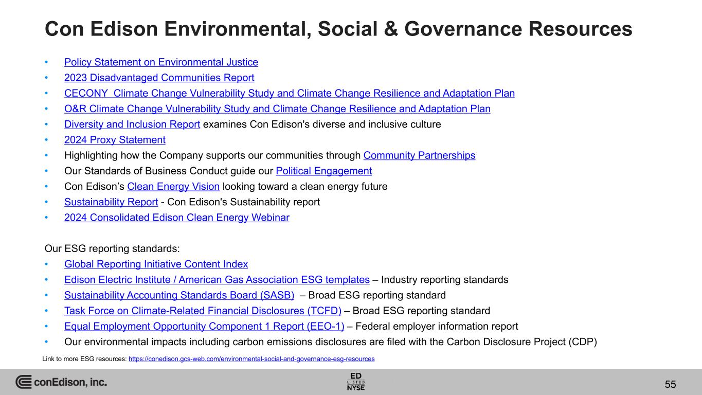 Con Edison Environmental, Social & Governance Resources • Policy Statement on Environmental Justice • 2023 Disadvantaged Communities Report • CECONY Climate Change Vulnerability Study and Climate Change Resilience and Adaptation Plan • O&R Climate Change Vulnerability Study and Climate Change Resilience and Adaptation Plan • Diversity and Inclusion Report examines Con Edison's diverse and inclusive culture • 2024 Proxy Statement • Highlighting how the Company supports our communities through Community Partnerships • Our Standards of Business Conduct guide our Political Engagement • Con Edison’s Clean Energy Vision looking toward a clean energy future • Sustainability Report - Con Edison's Sustainability report • 2024 Consolidated Edison Clean Energy Webinar Our ESG reporting standards: • Global Reporting Initiative Content Index • Edison Electric Institute / American Gas Association ESG templates – Industry reporting standards • Sustainability Accounting Standards Board (SASB) – Broad ESG reporting standard • Task Force on Climate-Related Financial Disclosures (TCFD) – Broad ESG reporting standard • Equal Employment Opportunity Component 1 Report (EEO-1) – Federal employer information report • Our environmental impacts including carbon emissions disclosures are filed with the Carbon Disclosure Project (CDP) Link to more ESG resources: https://conedison.gcs-web.com/environmental-social-and-governance-esg-resources 55