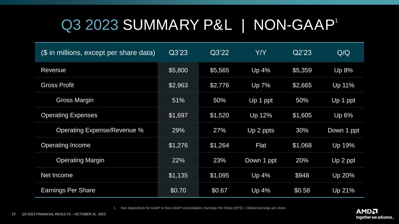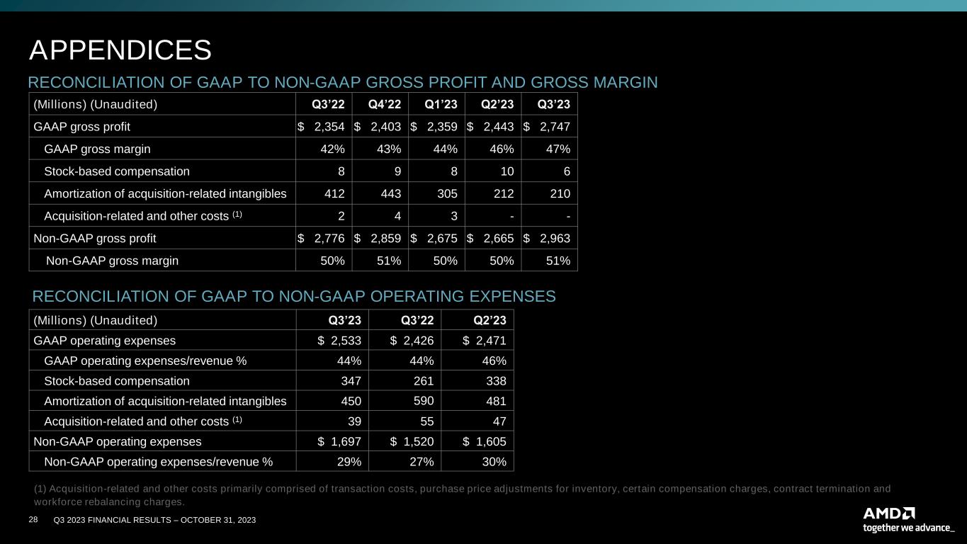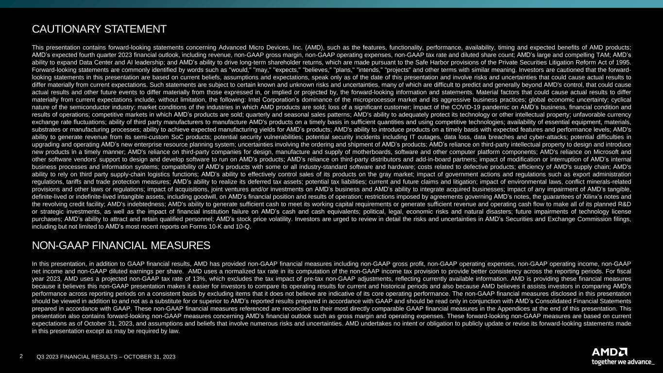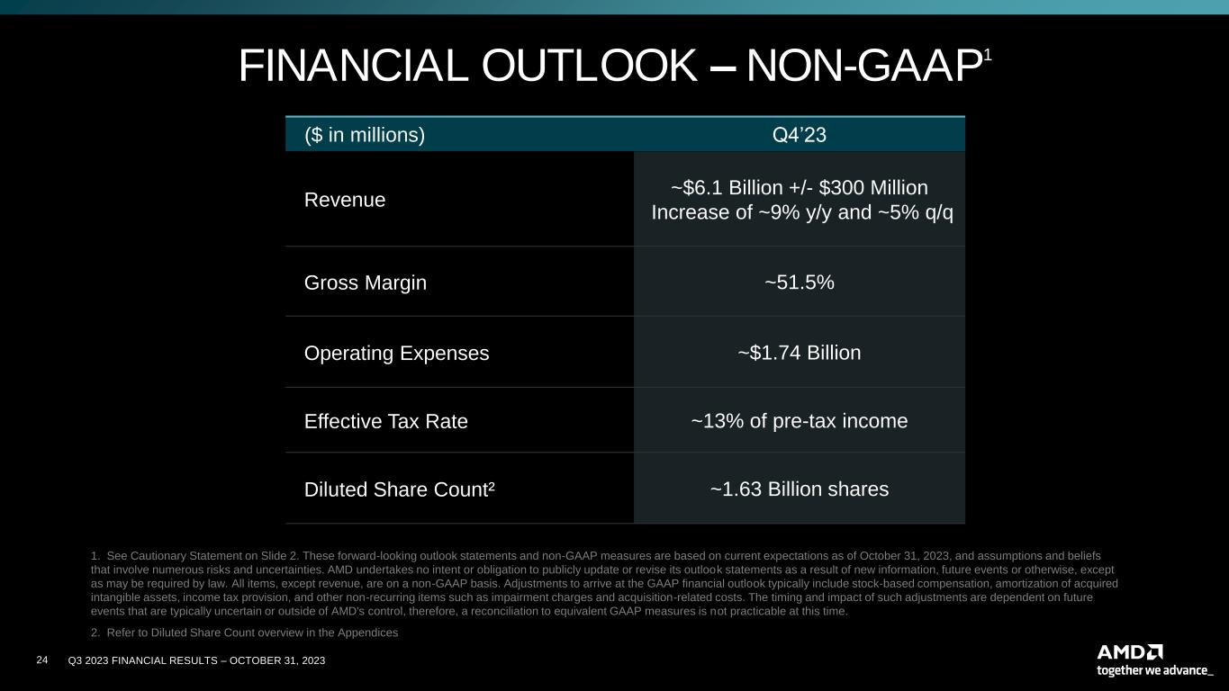 Q3 2023 FINANCIAL RESULTS – OCTOBER 31, 202322 CAUTIONARY STATEMENT This presentation contains forward-looking statements concerning Advanced Micro Devices, Inc. (AMD), such as the features, functionality, performance, availability, timing and expected benefits of AMD products; AMD’s expected fourth quarter 2023 financial outlook, including revenue, non-GAAP gross margin, non-GAAP operating expenses, non-GAAP tax rate and diluted share count; AMD’s large and compelling TAM; AMD’s ability to expand Data Center and AI leadership; and AMD’s ability to drive long-term shareholder returns, which are made pursuant to the Safe Harbor provisions of the Private Securities Litigation Reform Act of 1995. Forward-looking statements are commonly identified by words such as "would," "may," "expects," "believes," "plans," "intends," "projects" and other terms with similar meaning. Investors are cautioned that the forward- looking statements in this presentation are based on current beliefs, assumptions and expectations, speak only as of the date of this presentation and involve risks and uncertainties that could cause actual results to differ materially from current expectations. Such statements are subject to certain known and unknown risks and uncertainties, many of which are difficult to predict and generally beyond AMD's control, that could cause actual results and other future events to differ materially from those expressed in, or implied or projected by, the forward-looking information and statements. Material factors that could cause actual results to differ materially from current expectations include, without limitation, the following: Intel Corporation’s dominance of the microprocessor market and its aggressive business practices; global economic uncertainty; cyclical nature of the semiconductor industry; market conditions of the industries in which AMD products are sold; loss of a significant customer; impact of the COVID-19 pandemic on AMD’s business, financial condition and results of operations; competitive markets in which AMD’s products are sold; quarterly and seasonal sales patterns; AMD's ability to adequately protect its technology or other intellectual property; unfavorable currency exchange rate fluctuations; ability of third party manufacturers to manufacture AMD's products on a timely basis in sufficient quantities and using competitive technologies; availability of essential equipment, materials, substrates or manufacturing processes; ability to achieve expected manufacturing yields for AMD’s products; AMD's ability to introduce products on a timely basis with expected features and performance levels; AMD's ability to generate revenue from its semi-custom SoC products; potential security vulnerabilities; potential security incidents including IT outages, data loss, data breaches and cyber-attacks; potential difficulties in upgrading and operating AMD’s new enterprise resource planning system; uncertainties involving the ordering and shipment of AMD’s products; AMD’s reliance on third-party intellectual property to design and introduce new products in a timely manner; AMD's reliance on third-party companies for design, manufacture and supply of motherboards, software and other computer platform components; AMD's reliance on Microsoft and other software vendors' support to design and develop software to run on AMD’s products; AMD’s reliance on third-party distributors and add-in-board partners; impact of modification or interruption of AMD’s internal business processes and information systems; compatibility of AMD’s products with some or all industry-standard software and hardware; costs related to defective products; efficiency of AMD's supply chain; AMD's ability to rely on third party supply-chain logistics functions; AMD’s ability to effectively control sales of its products on the gray market; impact of government actions and regulations such as export administration regulations, tariffs and trade protection measures; AMD’s ability to realize its deferred tax assets; potential tax liabilities; current and future claims and litigation; impact of environmental laws, conflict minerals-related provisions and other laws or regulations; impact of acquisitions, joint ventures and/or investments on AMD’s business and AMD’s ability to integrate acquired businesses; impact of any impairment of AMD’s tangible, definite-lived or indefinite-lived intangible assets, including goodwill, on AMD’s financial position and results of operation; restrictions imposed by agreements governing AMD’s notes, the guarantees of Xilinx’s notes and the revolving credit facility; AMD's indebtedness; AMD's ability to generate sufficient cash to meet its working capital requirements or generate sufficient revenue and operating cash flow to make all of its planned R&D or strategic investments, as well as the impact of financial institution failure on AMD’s cash and cash equivalents; political, legal, economic risks and natural disasters; future impairments of technology license purchases; AMD’s ability to attract and retain qualified personnel; AMD’s stock price volatility. Investors are urged to review in detail the risks and uncertainties in AMD’s Securities and Exchange Commission filings, including but not limited to AMD’s most recent reports on Forms 10-K and 10-Q. NON-GAAP FINANCIAL MEASURES In this presentation, in addition to GAAP financial results, AMD has provided non-GAAP financial measures including non-GAAP gross profit, non-GAAP operating expenses, non-GAAP operating income, non-GAAP net income and non-GAAP diluted earnings per share. AMD uses a normalized tax rate in its computation of the non-GAAP income tax provision to provide better consistency across the reporting periods. For fiscal year 2023, AMD uses a projected non-GAAP tax rate of 13%, which excludes the tax impact of pre-tax non-GAAP adjustments, reflecting currently available