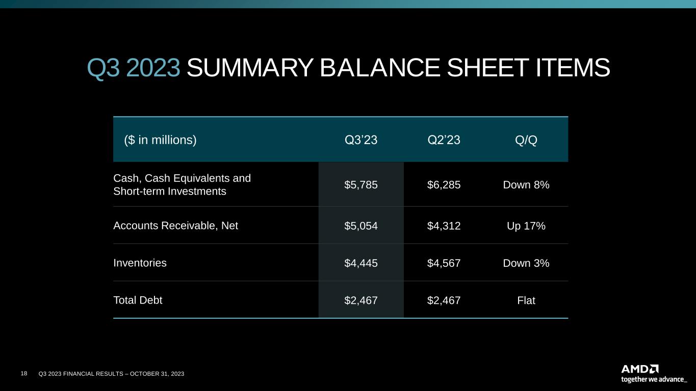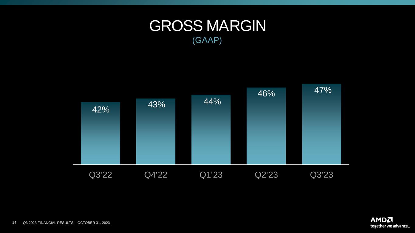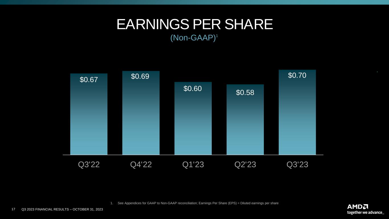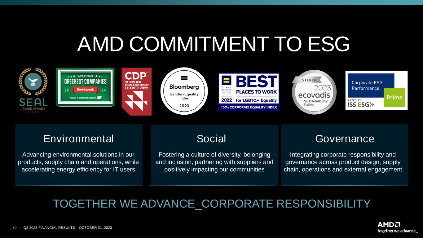 Q3 2023 FINANCIAL RESULTS – OCTOBER 31, 202322 CAUTIONARY STATEMENT This presentation contains forward-looking statements concerning Advanced Micro Devices, Inc. (AMD), such as the features, functionality, performance, availability, timing and expected benefits of AMD products; AMD’s expected fourth quarter 2023 financial outlook, including revenue, non-GAAP gross margin, non-GAAP operating expenses, non-GAAP tax rate and diluted share count; AMD’s large and compelling TAM; AMD’s ability to expand Data Center and AI leadership; and AMD’s ability to drive long-term shareholder returns, which are made pursuant to the Safe Harbor provisions of the Private Securities Litigation Reform Act of 1995. Forward-looking statements are commonly identified by words such as "would," "may," "expects," "believes," "plans," "intends," "projects" and other terms with similar meaning. Investors are cautioned that the forward- looking statements in this presentation are based on current beliefs, assumptions and expectations, speak only as of the date of this presentation and involve risks and uncertainties that could cause actual results to differ materially from current expectations. Such statements are subject to certain known and unknown risks and uncertainties, many of which are difficult to predict and generally beyond AMD's control, that could cause actual results and other future events to differ materially from those expressed in, or implied or projected by, the forward-looking information and statements. Material factors that could cause actual results to differ materially from current expectations include, without limitation, the following: Intel Corporation’s dominance of the microprocessor market and its aggressive business practices; global economic uncertainty; cyclical nature of the semiconductor industry; market conditions of the industries in which AMD products are sold; loss of a significant customer; impact of the COVID-19 pandemic on AMD’s business, financial condition and results of operations; competitive markets in which AMD’s products are sold; quarterly and seasonal sales patterns; AMD's ability to adequately protect its technology or other intellectual property; unfavorable currency exchange rate fluctuations; ability of third party manufacturers to manufacture AMD's products on a timely basis in sufficient quantities and using competitive technologies; availability of essential equipment, materials, substrates or manufacturing processes; ability to achieve expected manufacturing yields for AMD’s products; AMD's ability to introduce products on a timely basis with expected features and performance levels; AMD's ability to generate revenue from its semi-custom SoC products; potential security vulnerabilities; potential security incidents including IT outages, data loss, data breaches and cyber-attacks; potential difficulties in upgrading and operating AMD’s new enterprise resource planning system; uncertainties involving the ordering and shipment of AMD’s products; AMD’s reliance on third-party intellectual property to design and introduce new products in a timely manner; AMD's reliance on third-party companies for design, manufacture and supply of motherboards, software and other computer platform components; AMD's reliance on Microsoft and other software vendors' support to design and develop software to run on AMD’s products; AMD’s reliance on third-party distributors and add-in-board partners; impact of modification or interruption of AMD’s internal business processes and information systems; compatibility of AMD’s products with some or all industry-standard software and hardware; costs related to defective products; efficiency of AMD's supply chain; AMD's ability to rely on third party supply-chain logistics functions; AMD’s ability to effectively control sales of its products on the gray market; impact of government actions and regulations such as export administration regulations, tariffs and trade protection measures; AMD’s ability to realize its deferred tax assets; potential tax liabilities; current and future claims and litigation; impact of environmental laws, conflict minerals-related provisions and other laws or regulations; impact of acquisitions, joint ventures and/or investments on AMD’s business and AMD’s ability to integrate acquired businesses; impact of any impairment of AMD’s tangible, definite-lived or indefinite-lived intangible assets, including goodwill, on AMD’s financial position and results of operation; restrictions imposed by agreements governing AMD’s notes, the guarantees of Xilinx’s notes and the revolving credit facility; AMD's indebtedness; AMD's ability to generate sufficient cash to meet its working capital requirements or generate sufficient revenue and operating cash flow to make all of its planned R&D or strategic investments, as well as the impact of financial institution failure on AMD’s cash and cash equivalents; political, legal, economic risks and natural disasters; future impairments of technology license purchases; AMD’s ability to attract and retain qualified personnel; AMD’s stock price volatility. Investors are urged to review in detail the risks and uncertainties in AMD’s Securities and Exchange Commission filings, including but not limited to AMD’s most recent reports on Forms 10-K and 10-Q. NON-GAAP FINANCIAL MEASURES In this presentation, in addition to GAAP financial results, AMD has provided non-GAAP financial measures including non-GAAP gross profit, non-GAAP operating expenses, non-GAAP operating income, non-GAAP net income and non-GAAP diluted earnings per share. AMD uses a normalized tax rate in its computation of the non-GAAP income tax provision to provide better consistency across the reporting periods. For fiscal year 2023, AMD uses a projected non-GAAP tax rate of 13%, which excludes the tax impact of pre-tax non-GAAP adjustments, reflecting currently available
