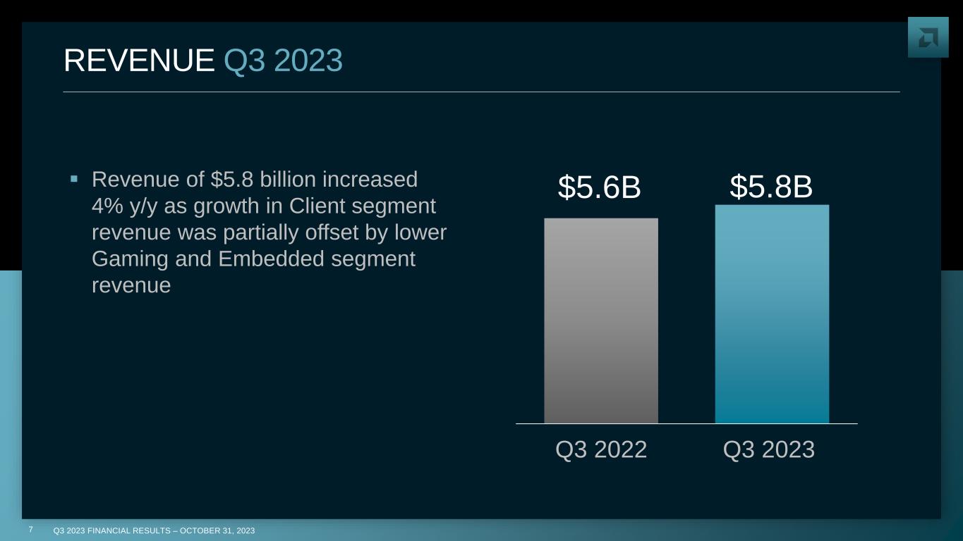 AMD IS UNIQUELY POSITIONED IN AI RyzenTM 7040 Mobile processors with AI accelerator First x86 CPU with Integrated AI accelerator Embedded VersalTM AI Edge ZynqTM MPSoC Adaptive SoC + AI for Embedded AMD AlveoTM Accelerators AI Inference Optimized Solutions DELIVERING A COMPREHENSIVE AI COMPUTE PORTFOLIO Q3 2023 FINANCIAL RESULTS | OCTOBER 31, 20236 AMD InstinctTM MI250 & MI300 Accelerators Data Center HPC and AI Solutions AMD 4th Gen EPYCTM Processors Leadership Server Solutions