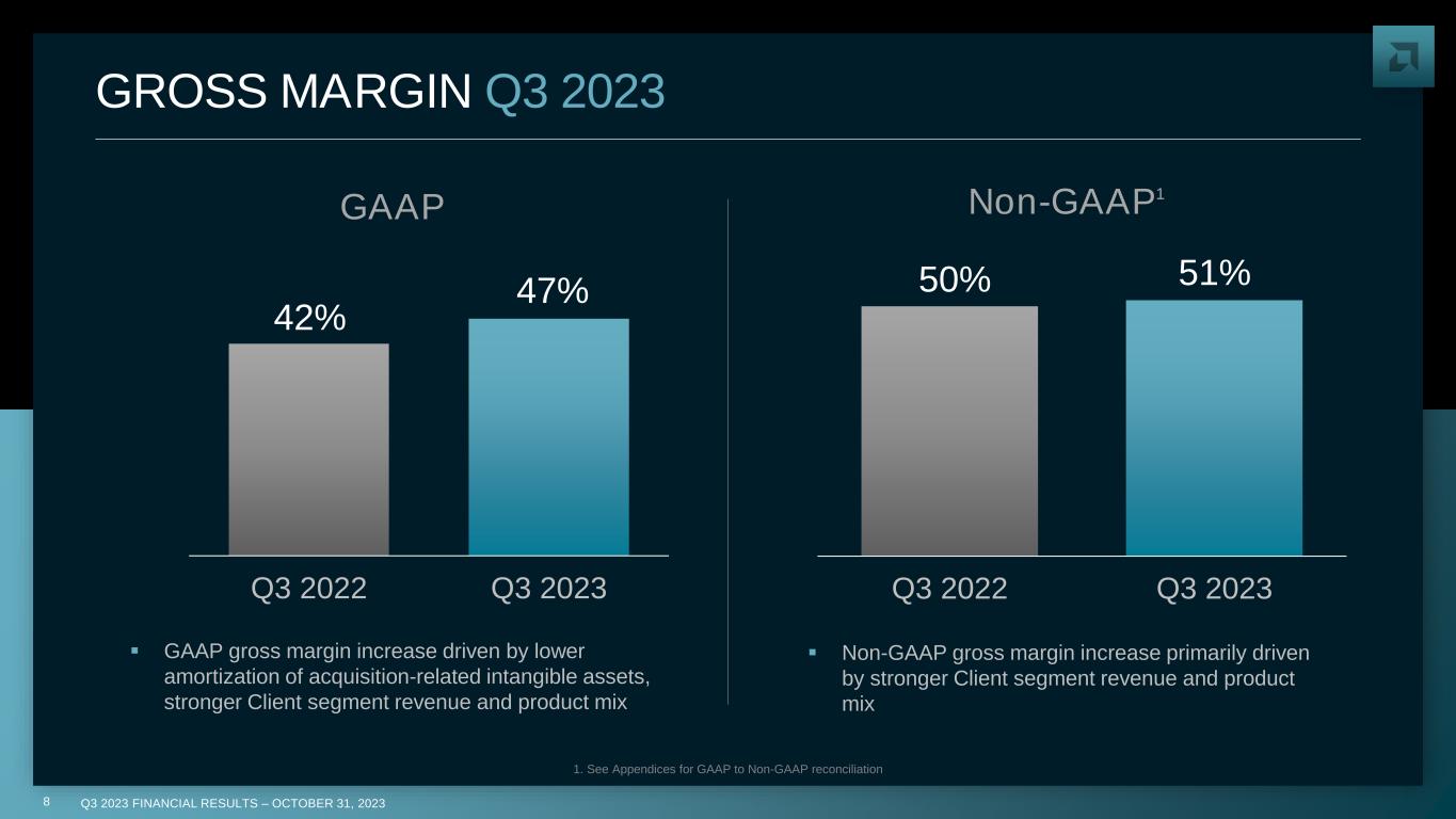 Q3 2023 FINANCIAL RESULTS – OCTOBER 31, 20237 REVENUE Q3 2023 ▪ Revenue of $5.8 billion increased 4% y/y as growth in Client segment revenue was partially offset by lower Gaming and Embedded segment revenue $5.6B $5.8B Q3 2022 Q3 2023